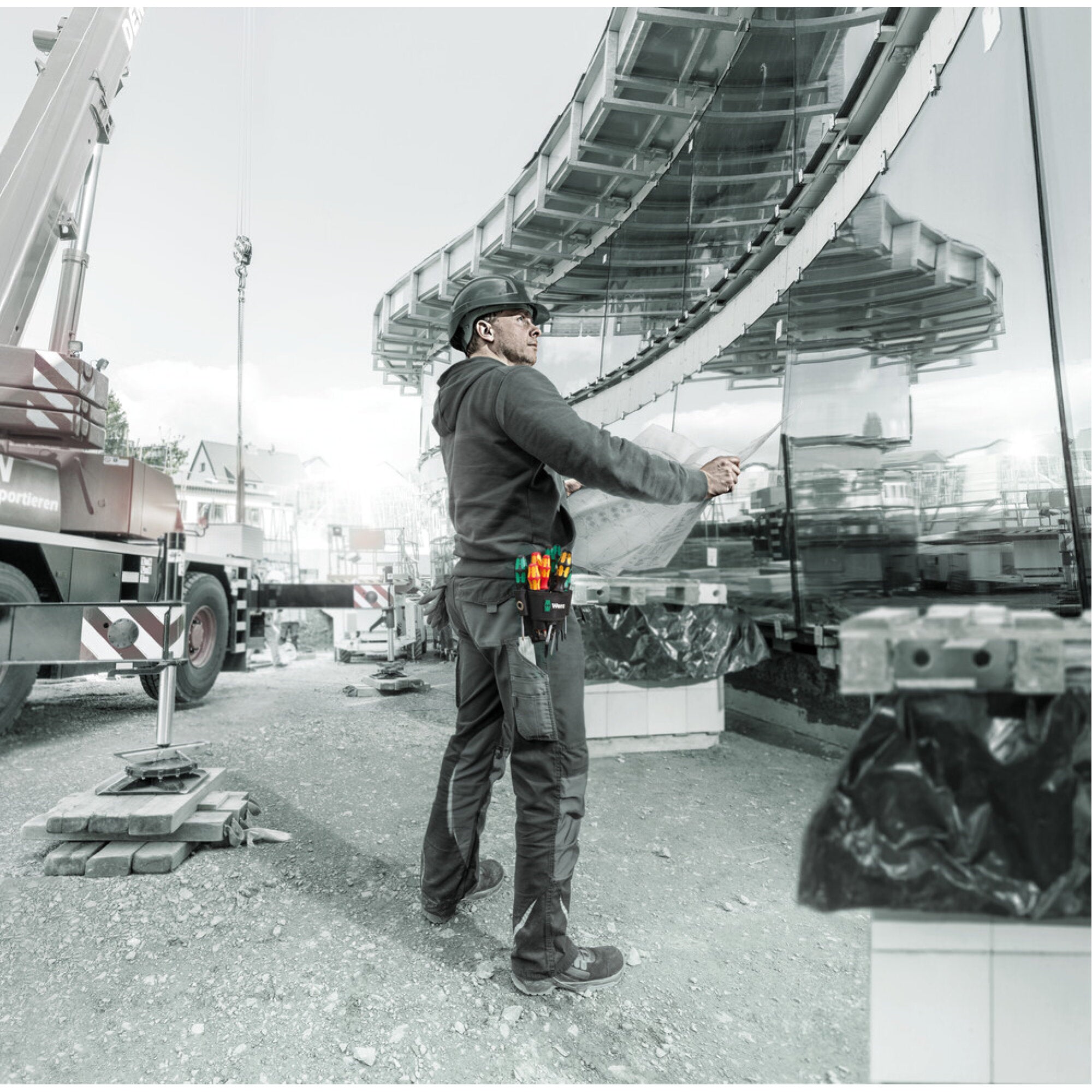 The tool set for the belt. The tool holster has 5 zones for inserting and accessing the required tools at any time. The holster has a robust construction, is made of tear-resistant material and is also suitable for use in adverse conditions. The included tools can be supplemented or exchanged individually.The holster can be worn on the hips. Ideal for mobile use at different locations. Kraftform Plus handle for comfortable ergonomic screwdriving, avoiding blisters and calluses. Hard handle zones for high working speeds, while soft handle zones guarantee a high torque transfer. Includes some tools with Lasertip: The tips of Wera Lasertip screwdrivers are microscopically roughened with laser beams. This rough surface "bites" into the screw head and unintentional slipping is a thing of the past. "Take it easy" tool finder with colour coding by profile and size stamping - for quick and easy identification of the required tool.