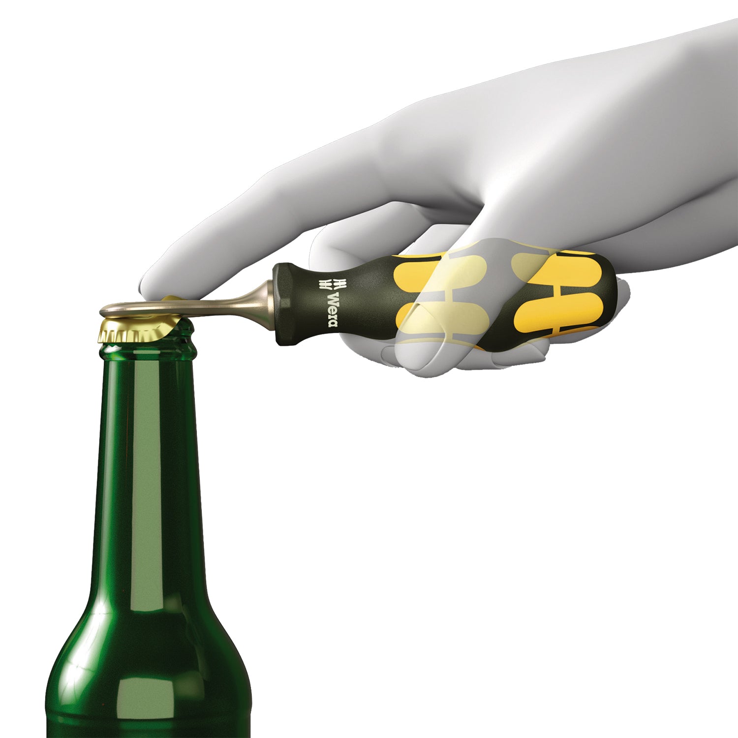 6-piece Wera chiseldriver set for screwdriving, chiselling, mortising and slackening stuck screws. With a multi-component Kraftform handle for fast and gentle work. Kraftform Plus: Hard handle zones for high working speeds, while soft handle zones guarantee high torque transfer. With pound-thru hexagon blade made of premium bit material, thereby giving lossless power transmission even with hammer blows. Tough tempered material to prevent the blade from chipping or breaking. With integrated impact cap to increase service life and reduce risk of splintering. The Wera Black Point tip and a sophisticated hardening process garantee a long usability of the tip, increased corrosion protection and exact fitting accuracy. With hexagon anti-roll protection to avoid bits from annoying rolling away in the workplace. Plus iconic Wera bottle opener.