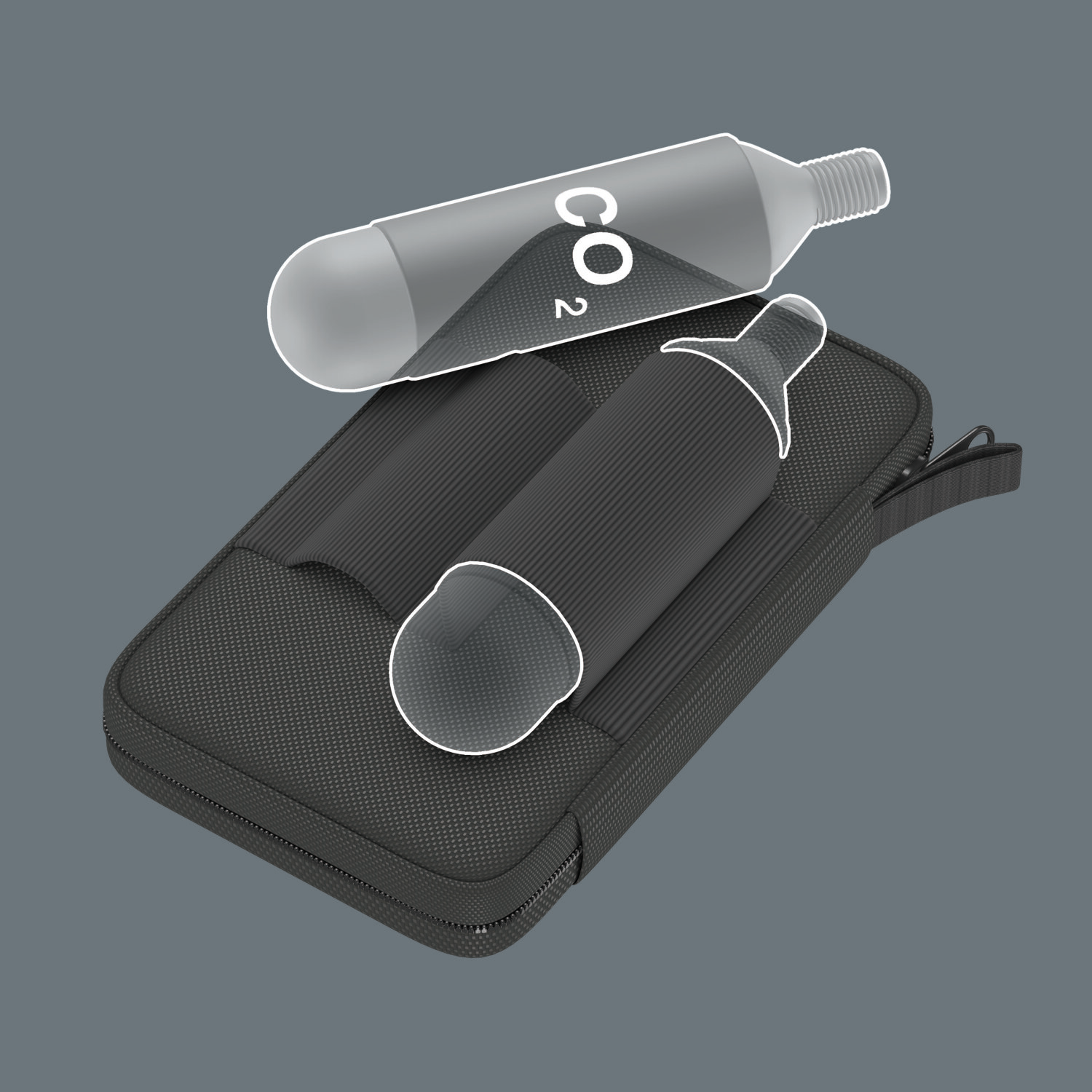 Bike tool set with ratchet, bits, sockets and a bitholding screwdriver in the very compact Tool-Check. Perfect as a universal companion for a multitude of screwdriving applications. An added extra: The set comes with two pouches- a larger pouch for the complete tool set and a small soft pouch to store the tools safely in your shirt pocket when you are on the go. The soft pouch has additional loops for holding two CO<sub>2</sub> cartridges (the cartridges are not included).<br>With useful bike tools (chain riveter and chain fastener) to repair bike chains.<br>Premium bitholding screwdriver with Kraftform Plus handle for comfortable ergonomic screwdriving. Bit ratchet for quick working when screwdriving with a machine or conventional hand tool is not possible due to space constraints. Rapid reversing from clockwise to counterclockwise rotation and vice versa via the reversing lever. The knurling on the ratchet head allows for quick rotation (with the thumb). Easiest operation, even with just one hand. Ergonomic ratchet head/lever: Kraftform geometry with perfectly shaped contact surfaces for the fingers. The direct bit mounting in the ratchet head provides small tool design for low working heights. Small return angle of 6° for precise working. Robust drop-forged solid steel design. Torques of over 65 Nm. The Rapidaptor bitholding screwdriver with fast-rotating sleeve: Can be used as an extension, for lightning-fast bit changes for even very small bit sizes with just one hand and without any extra tools.<br>Bits (BTZ) with BiTorsion zone to cushion peak loads for universal use; tough bits (Z) for universal use.<br>Zyklop sockets with colour coding by size as well as size stamping - to help you find the required socket quickly and easily. Slip-proof thanks to the knurling at the rear end for easy handling even with oily hands. With ball stop groove. For external hexagon bolts and screws. Made of matt chrome-plated chrome-vanadium.<br>With the glass fibre reinforced plastic tyre levers, the tyres can be safely levered off the rim without damaging the rim. One tyre lever with valve ejector, one tyre lever with ¼" bit mounting.