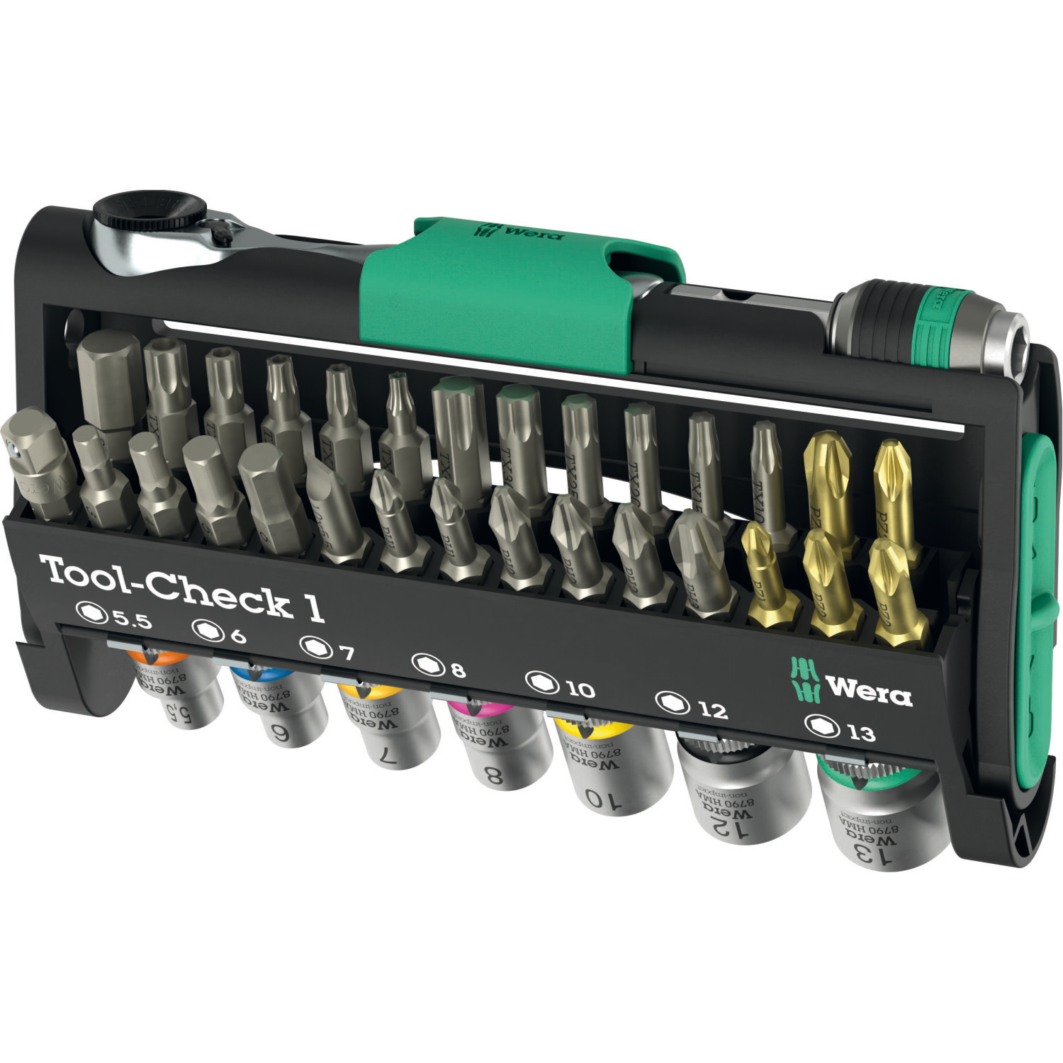 38-piece set. Very compact tool set for manual and machine use. The green locking elements of the Tool-Check secure the tools during transport. Includes one 1/4" bit ratchet in drop-forged solid steel design. Fine toothing mechanism (60 teeth) for a small return angle of 6° for precise working. Easy clockwise/counterclockwise switching. Ergonomically shaped ratchet head and lever. 1/4" sockets can also be used with the Wera 870/1 adapter (1/4" external hexagon to 1/4" external square head) included in the set. 7 Zyklop sockets (1/4", for manual and machine-operated tools); with ball stop groove. Knurling at the rear end for manageability during manual screwdriving. With Take it easy tool finder: colour coding by size - for quick and easy identification of the required tool. Made of matt chrome-plated chrome-vanadium. 28 tough bits (Phillips and Pozidriv, TORX®, TORX® BO, slotted and hexagonal socket) for universal use. In the very compact, functional Tool-Check.