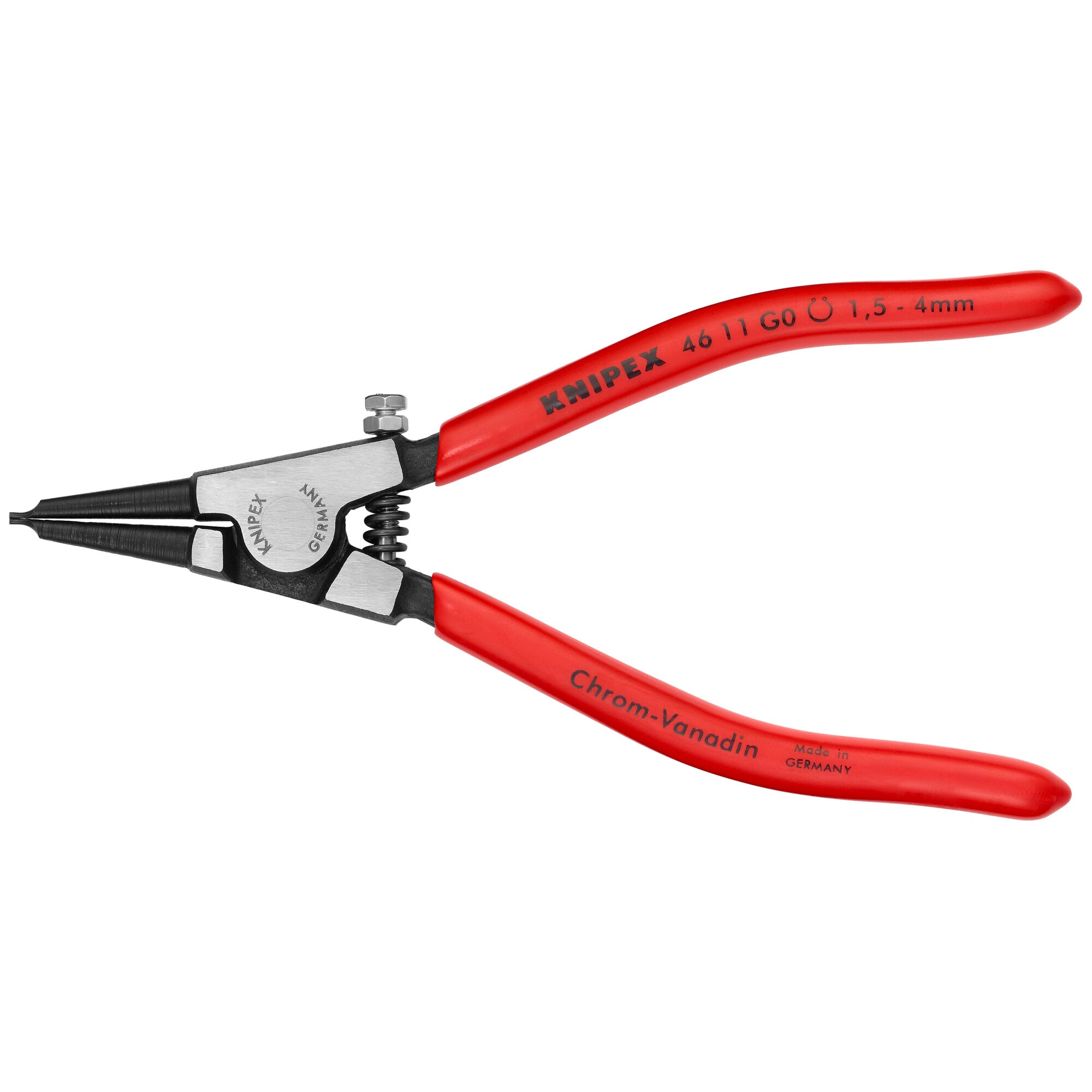 For fitting grip rings on shafts ranging from 1/16" - 5/32". Includes opening spring for easy repetitive work. Solid style, forged. Non-slip, straight solid tips. Adjustable stop screw to prevent overstretching, for rings from 1/16" to 5/32" dia.. Pliers body and tips: chrome vanadium steel; forged, oil-hardened.