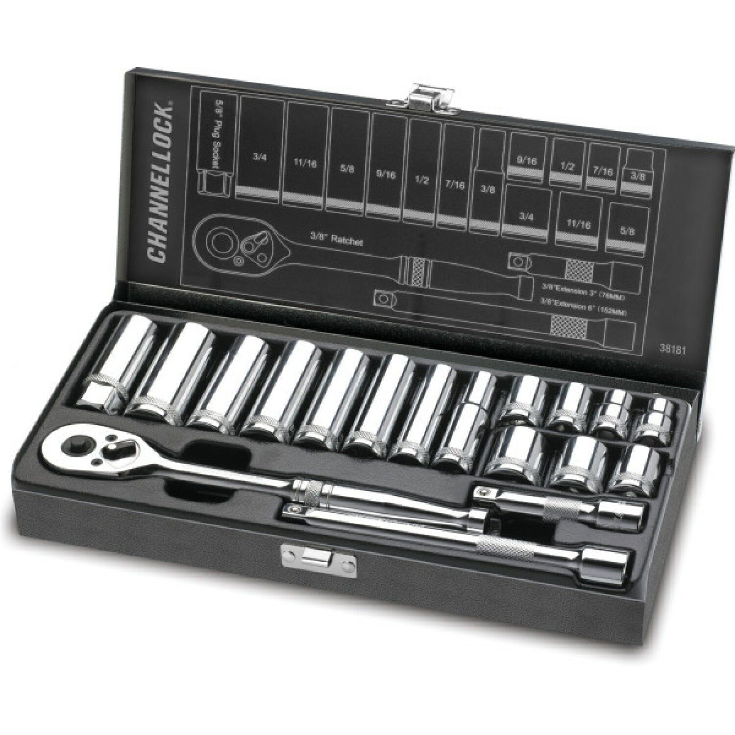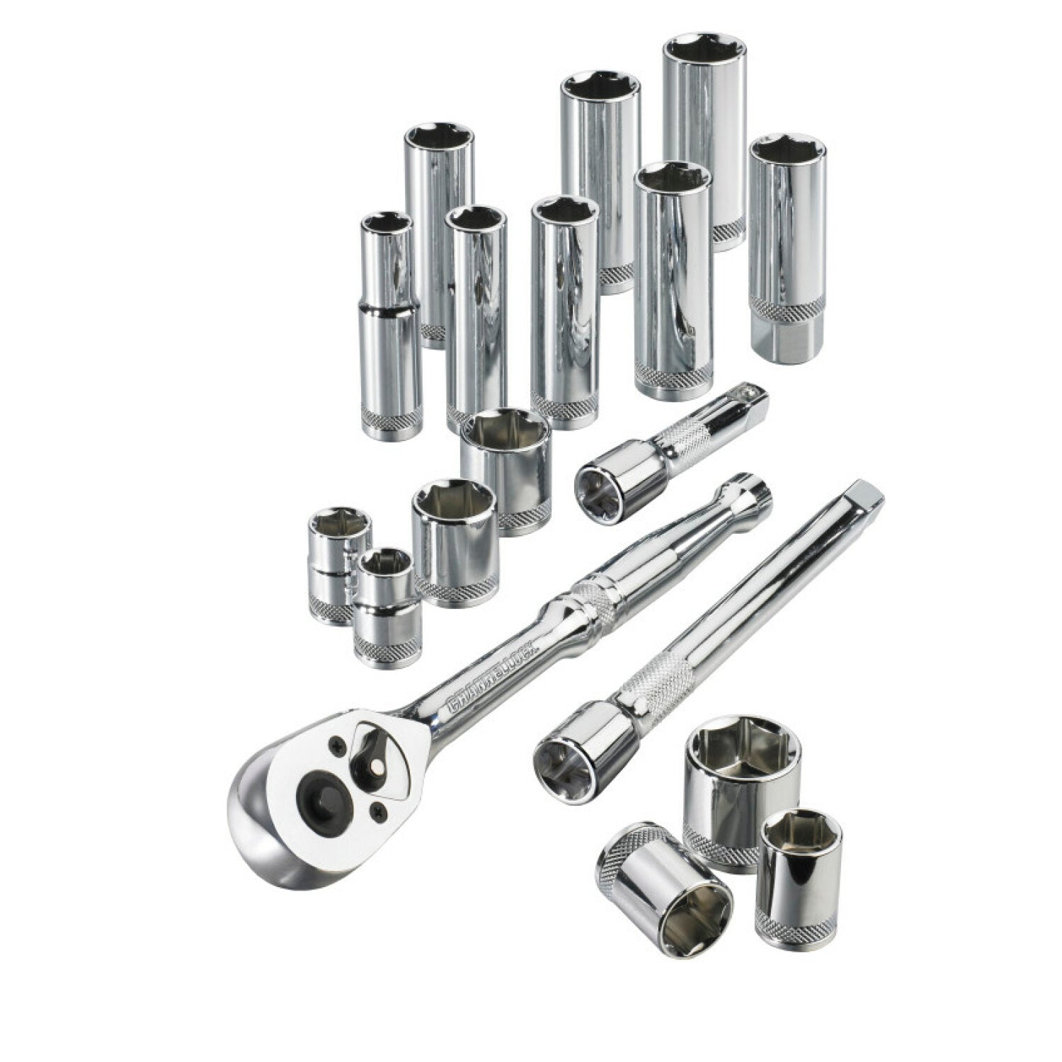 CONTENTS: 6 pt. Deep Well Sockets: 3/8, 7/16, 1/2, 9/16, 5/8, 11/16, 3/4 inch, 6 pt. Standard Sockets: 3/8, 7/16, 1/2, 9/16, 5/8, 11/16, 3/4 inch, 5/8 inch Spark Plug Socket, 3 inch (76mm) Extension, 6 inch (152mm) Extension, Quick Release 45 Gear Teeth Ratchet