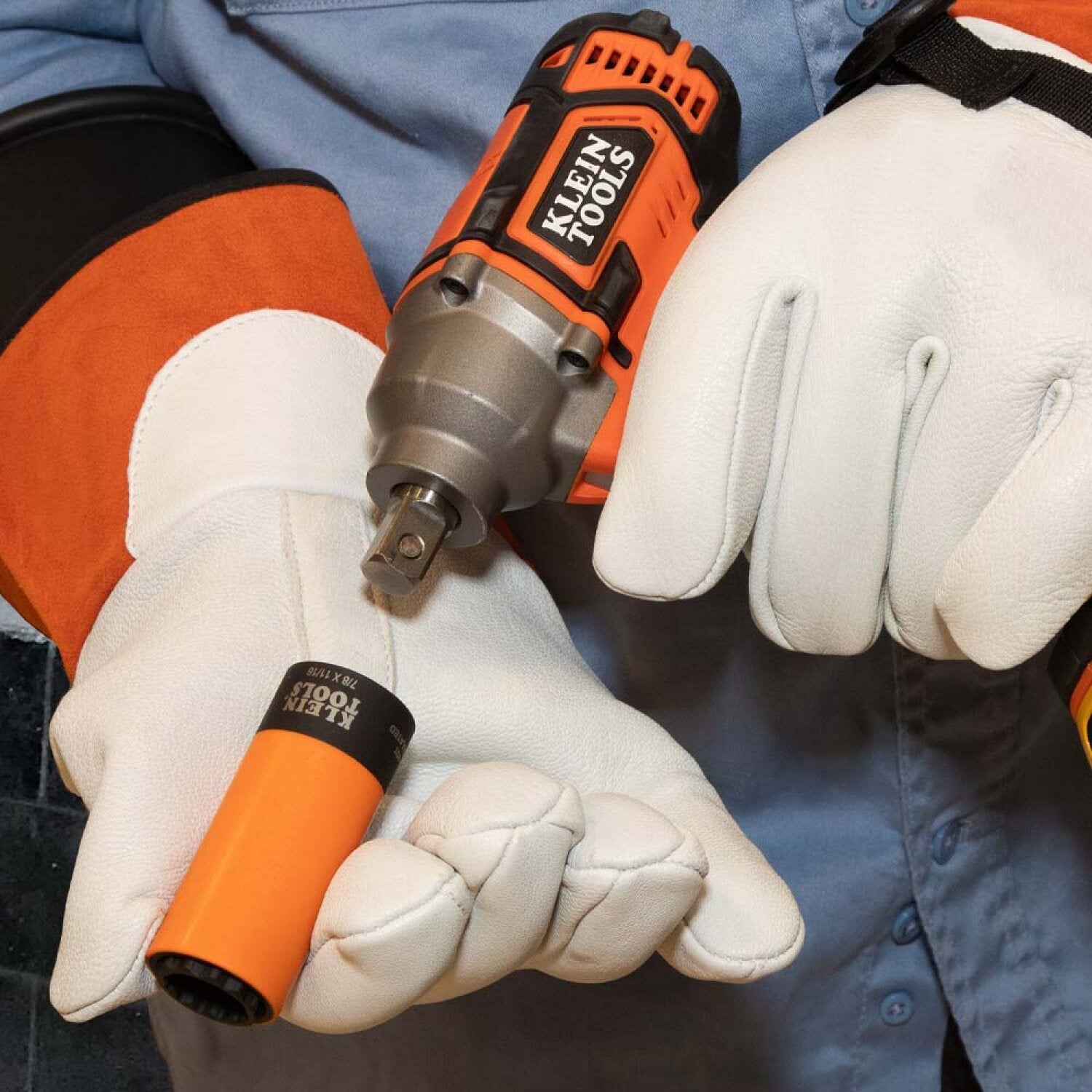Klein's 6-Piece Coated Socket Set consisting of the commonly used impact socket sizes for utility and construction work. Sockets are 20-Percent lighter than the traditional impact socket set (Cat. No. 66010). The high-torque, 12-Point design is easier to position on fasteners including square ones. The high visibility color coded plastic helps identify the right size socket for the job.