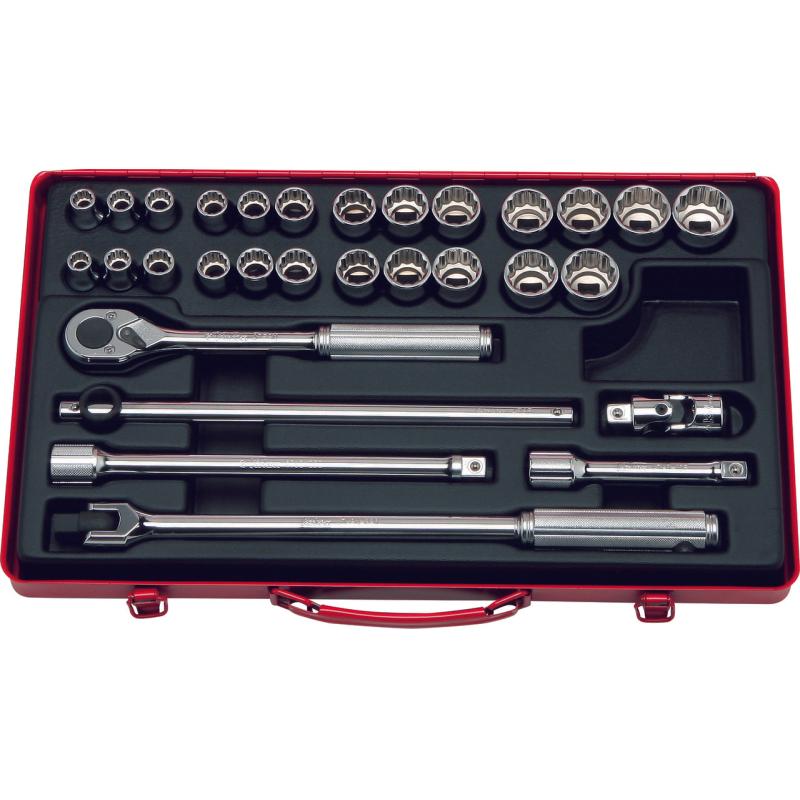 Ko-ken 4273AM 1/2 Sq. Dr. Socket set 12 point 30 pieces. Input Drive Size: 1/2" Drive Shape: Square Type: 12 Point Socket Set Includes: 4405M 12 pt Sockets: 10, 11, 12, 13, 14, 17, 19, 21, 22, 23, 24, 26, 27 4405A 12 pt. Sockets: 3/8", 7/16", 1/2", 9/16", 5/8", 11/16", 3/4", 13/16", 7/8", 15/16", 1" 4753N Ratchet 4760-125: 125mm Extension Bar 4760-250 250mm Extension Bar 4768N-380 380mm Breaker Bar 4770 Universal Joint 4785 Sliding T Handle Metal Case: W446xH266xT50mm.