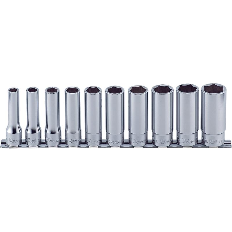 Ko-ken RS4300A/10 1/2 Sq. Dr. Socket set 3/8-15/16 6 point 300mm 10 pieces. Length: 300 mm Drive: 1/2″ internal square 3/8, 7/16, 1/2, 9/16, 5/8, 11/16, 3/4, 13/16, 7/8, 15/16 Inch. Hexagon socket Surface: chrome-plated Material: chrome molybdenum steel.