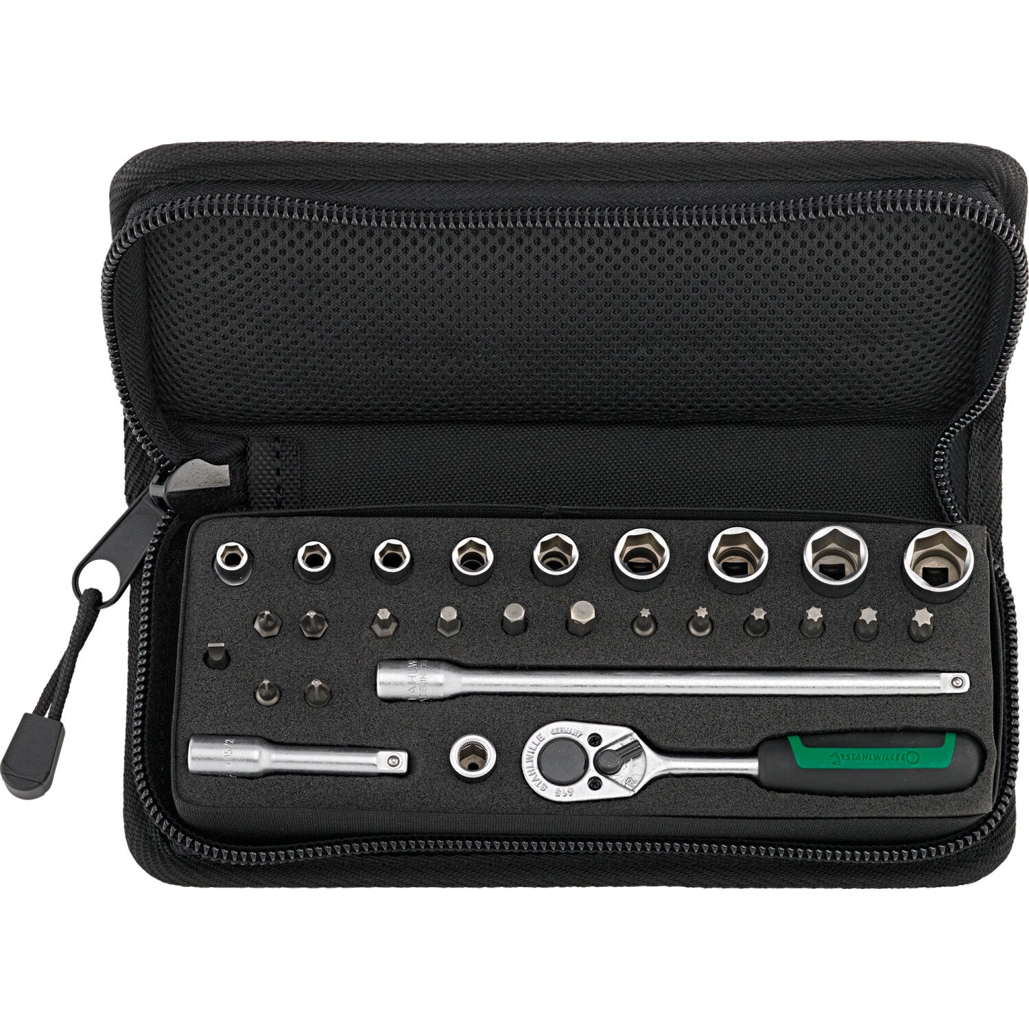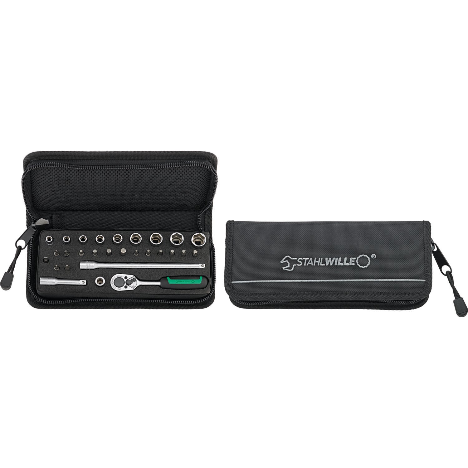 - Contains a 1/4" ratchet, socket spanner inserts, bits, extensions and a bit holder.