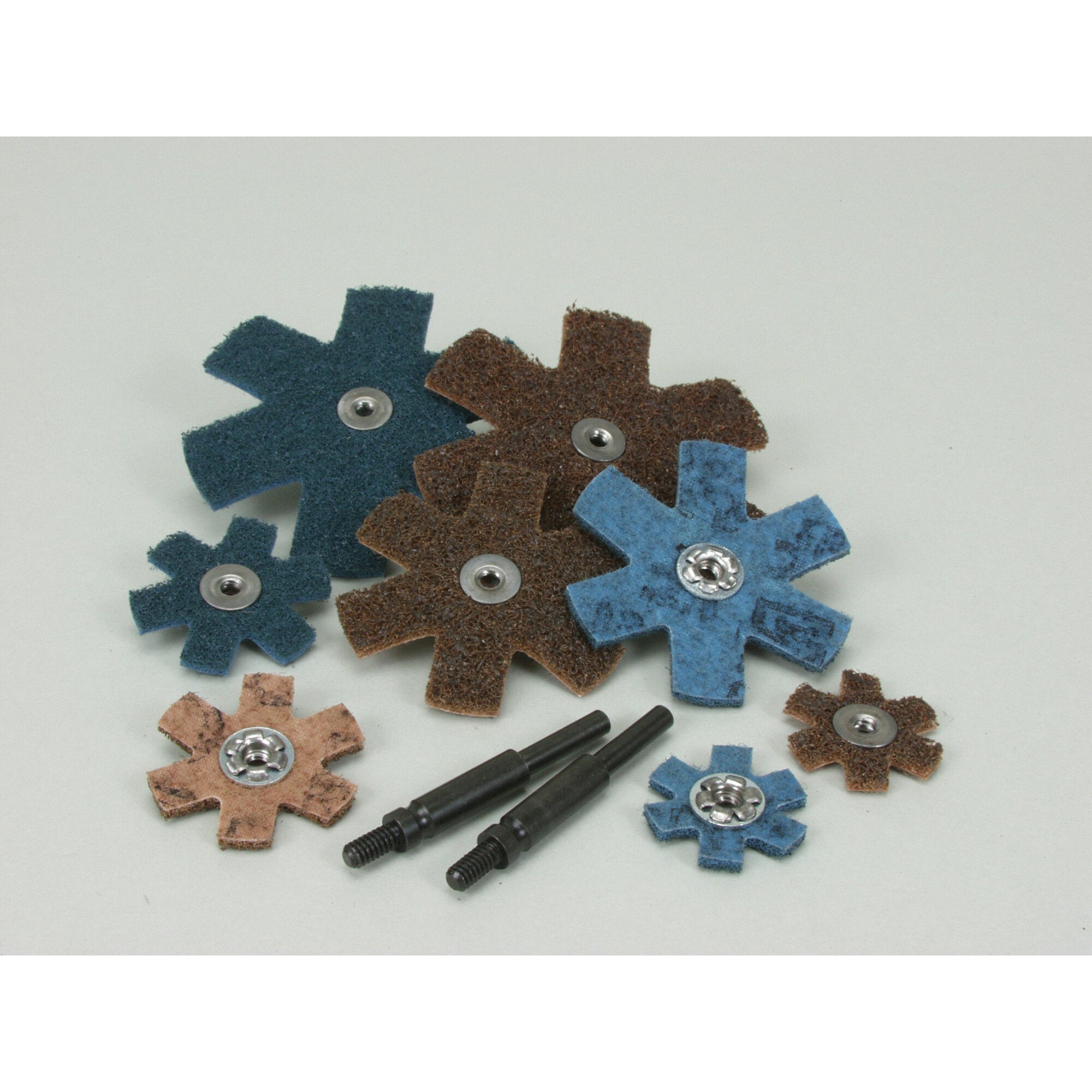 The Scotch-Brite™ Star may be used with 3M mandrel 944 (sold separately).The threaded attachments fasten to mandrel 944 for safe use on a die grinder. Scotch-Brite™ Star requires low pressure when used at correct operating speeds. [Reviewer please confirm].The abrasive is available in coarse (CRS) and very fine (VFN) grades. Use a coarse abrasive when refining a deep grind line/scratch or when a more aggressive scratch pattern is desired, and use a fine abrasive when a soft, fine scratch pattern is desired. Scotch-Brite™ Star comes in packs of 50 or 100 stars per case to minimize the need for ordering replacements and to help reduce operating costs.
