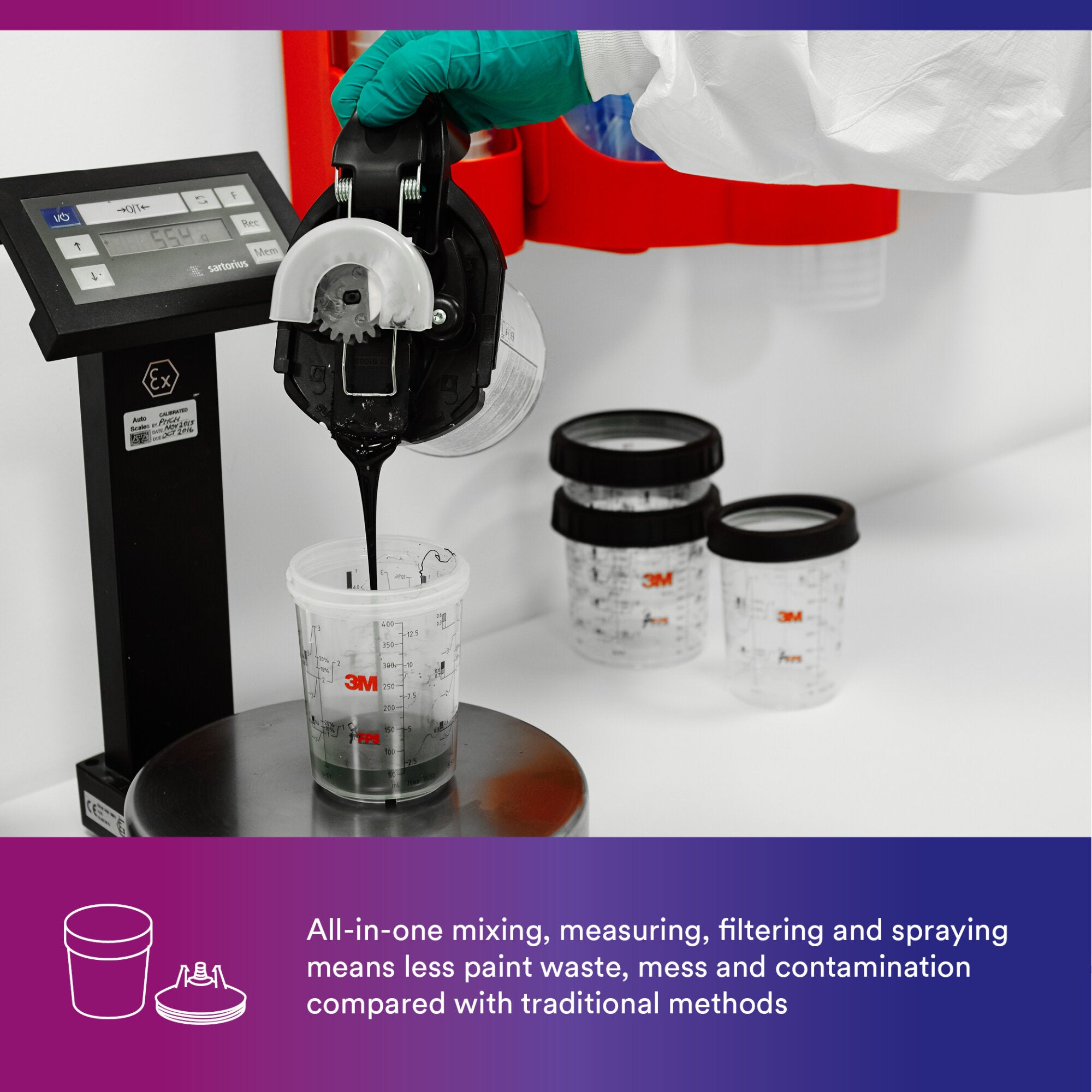 Unlike conventional paint cup systems, our 3M™ PPS™ eliminates the need for mixing paint in additional paint mix cups and then transferring the paint through a separate filter into a paint reservoir. This is an important advantage because waste occurs every time a user transfers paint through mixing cups and filters. With PPS™, you place the disposable liner within the re-usable PPS™ Cup. Then simply mix the paint in the PPS™ disposable liner, snap the disposable lid (with the pre-welded filter) in place and attach the locking collar to complete the PPS™ System. With just these few simple steps, you're ready to start spraying.