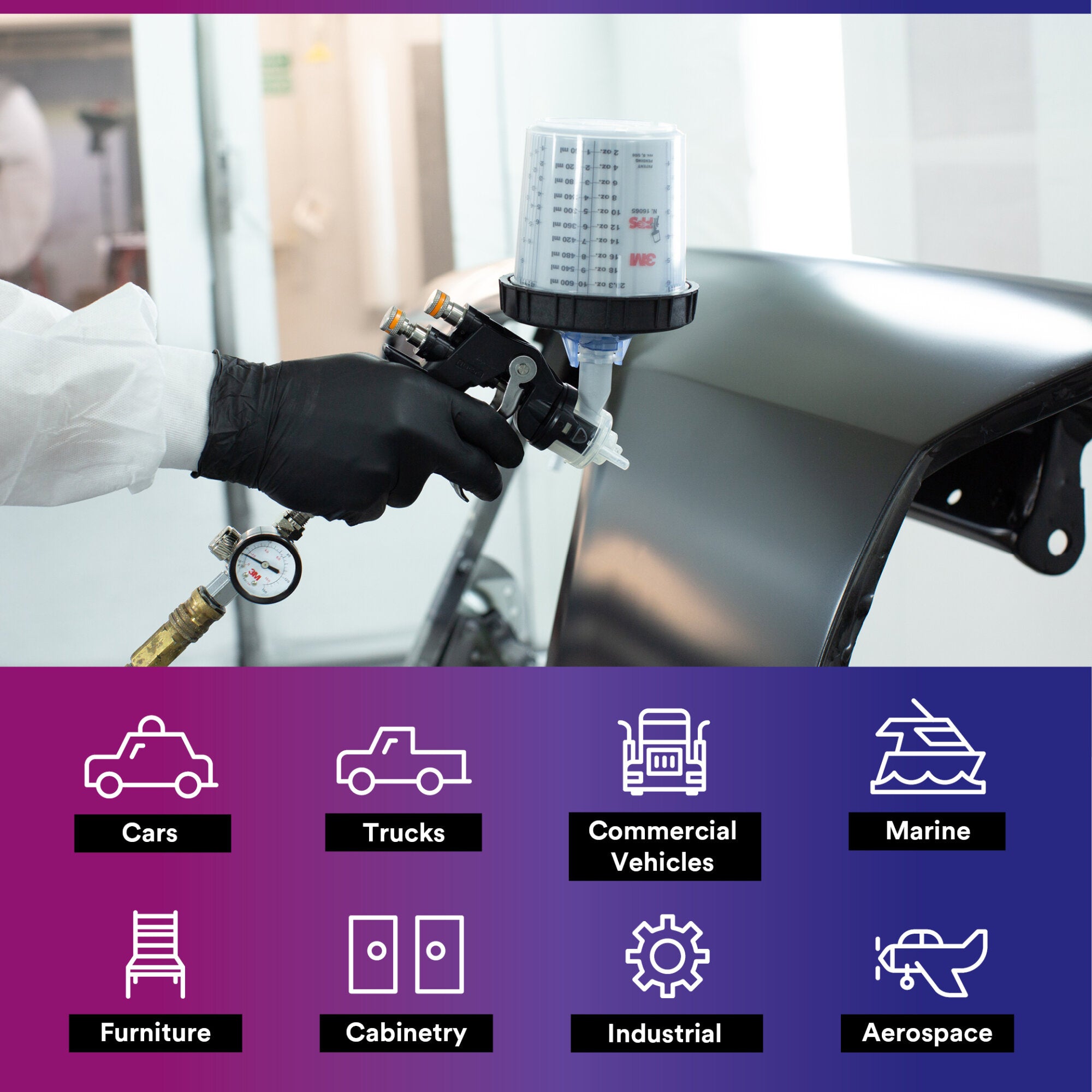 3M™ PPS™ is an all-in-one disposable painting system that produces cleaner jobs, saves on paint consumption and reduces solvent usage by up to 70%. You'll find that technicians operate with greater efficiency and spend less time on cleaning tasks. 3M PPS offers many advantages for anyone spraying liquid coatings from a spray gun with cup.