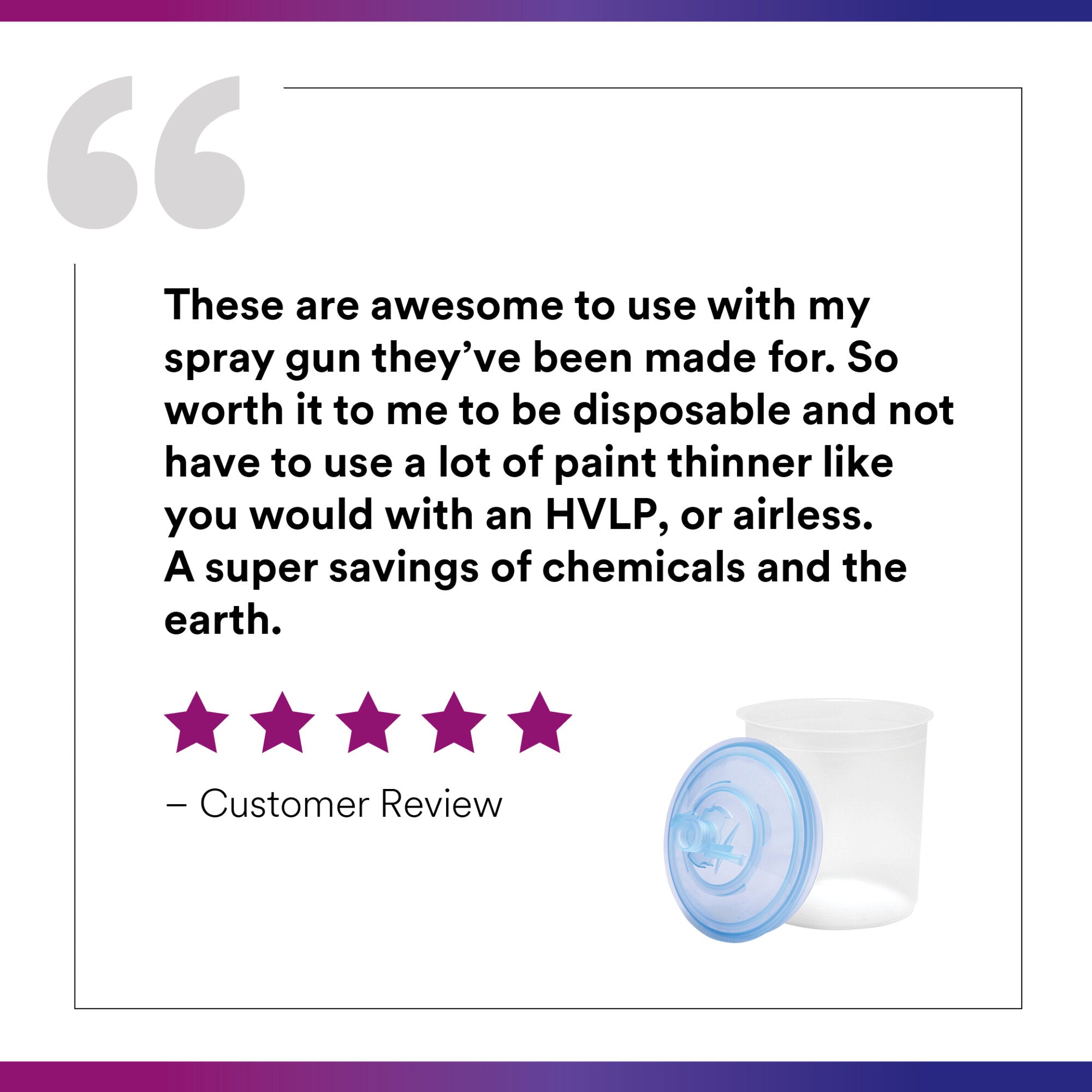 Because the painter uses a new disposable lid (with welded-in filter) and disposable liner for each mix, there is less risk of outside contamination due to mixing, filtering and clean up. Using a fresh lid and liner with each paint job, rather than washing out reusable components often improves overall productivity in prep and clean-up time by as much as 50%.