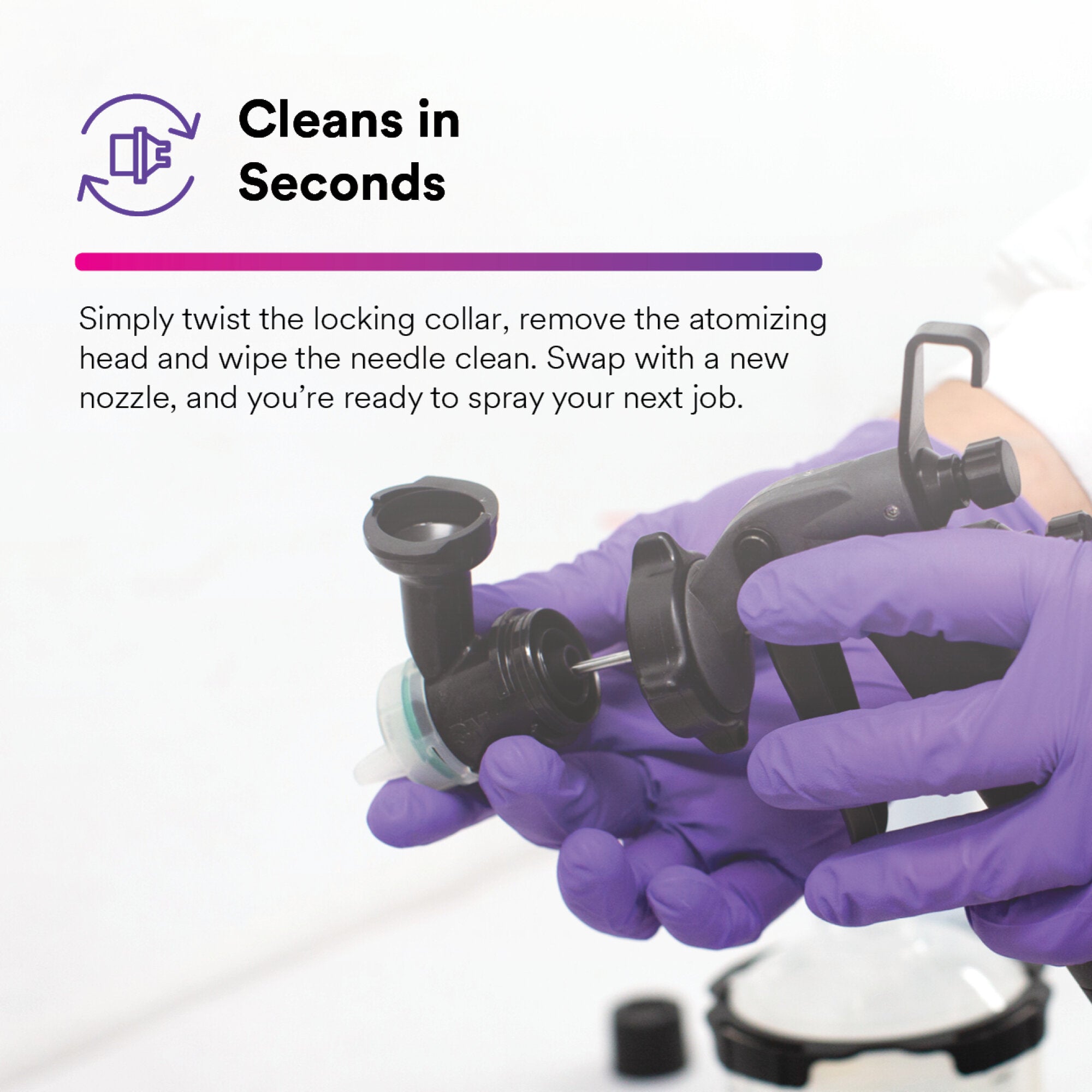 The replaceable nozzles are used exclusively with the gravity-fed 3M™ PPS™ Series 2.0 Spray Cup System, which helps to reduce material waste, mess and contamination compared to traditional metal paint cups. Forget about tearing down spray guns and soaking in solvent. Our complete, integrated spray system is your path to smarter cleanup.