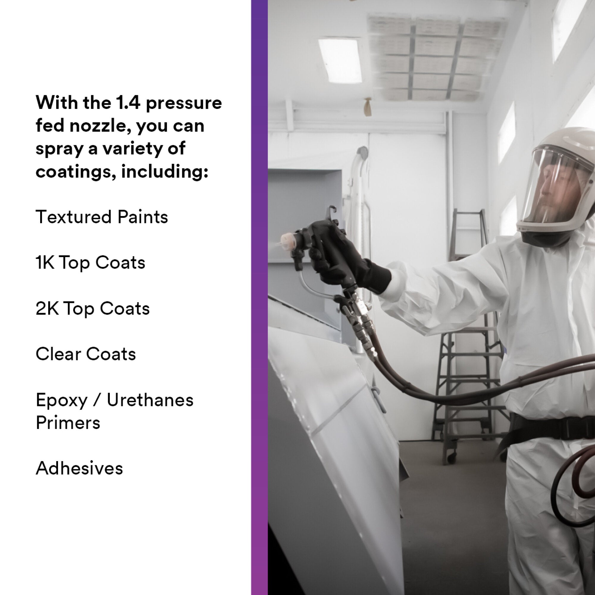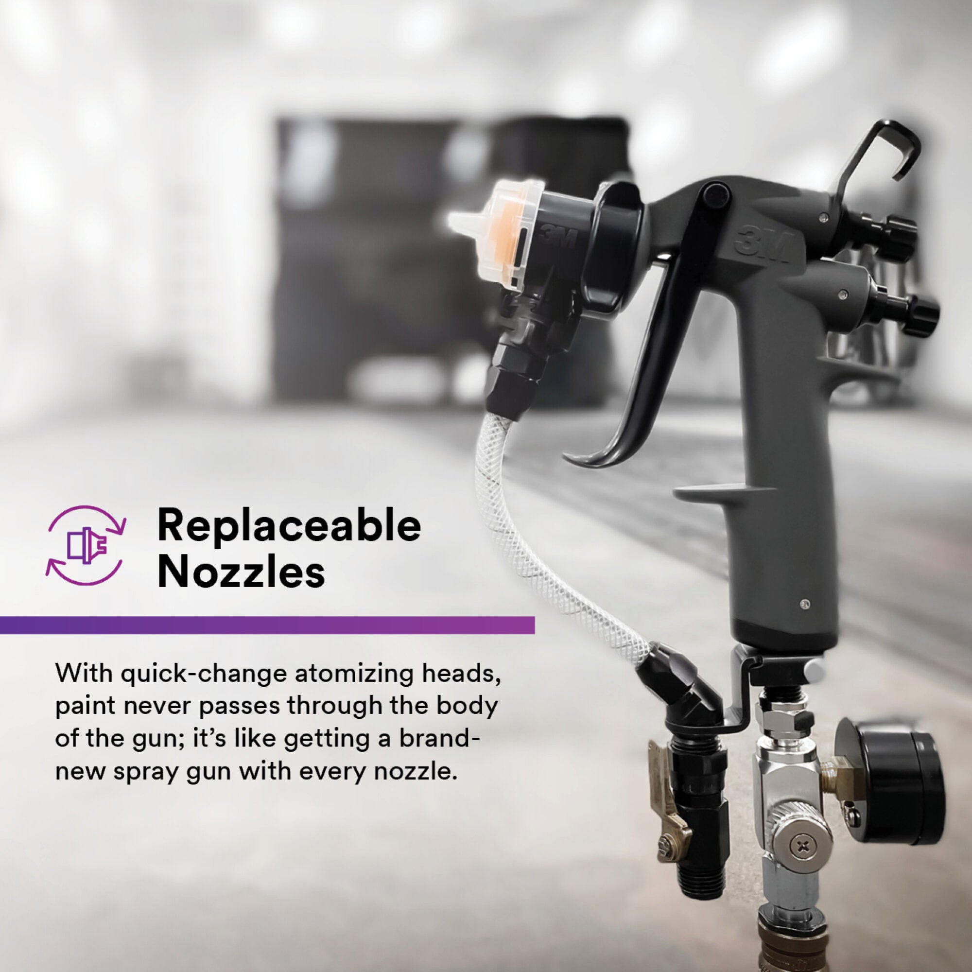 3M Performance Pressure HVLP Atomizing Heads are designed to deliver excellent spray performance for coatings including stains, primers, base coats, topcoats, clear coats and adhesives. Replaceable nozzles are built exclusively for pressure-feed applications using the 3M Performance Spray Gun, offering like-new spray performance with the change of each nozzle.What makes the 3M™ Performance Spray Gun system different is the technology inside the quick-change replaceable nozzles. Because paint and coatings never pass through the body of the spray gun – and only the atomizing head – it's like getting a brand-new spray gun every time you swap the nozzle. Get the pattern control, atomization and transfer efficiency you expect from a premium spray gun – all while helping to drive more consistent spray performance across each job, every day.