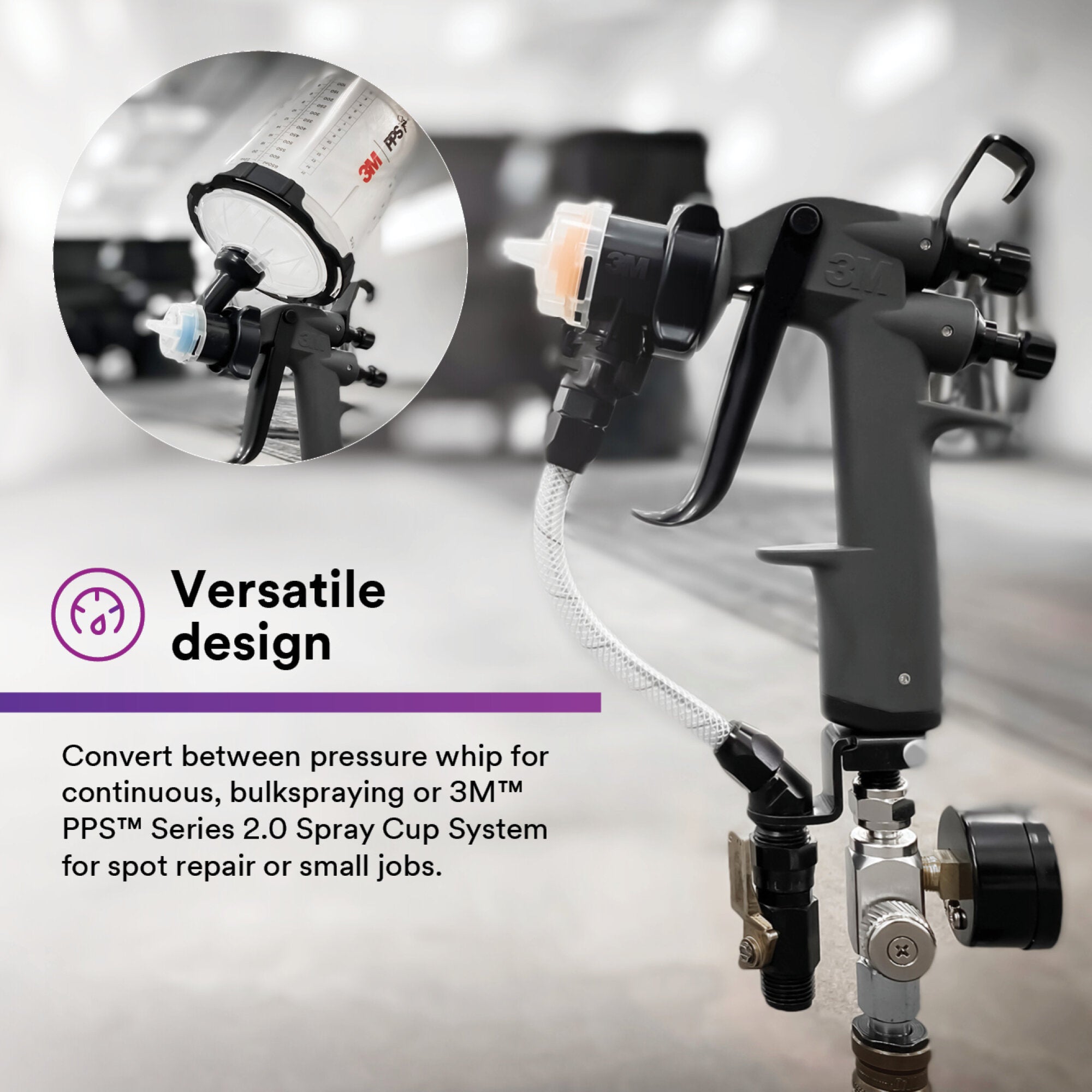 The replaceable nozzles are used exclusively with the 3M™ Performance Spray Gun system and attach to a supply hose for continuous, bulk spraying from a pressure pot or pressure tank. The atomizing heads attach to the 3M™ Performance Spray Gun whip hose and are tightly secured to the spray gun with a specially-designed locking collar. No additional tools required for changeouts. Simply remove the nozzle from the spray gun, and either appropriately clean the fluid tip or replace it to keep your spray gun performing like new.