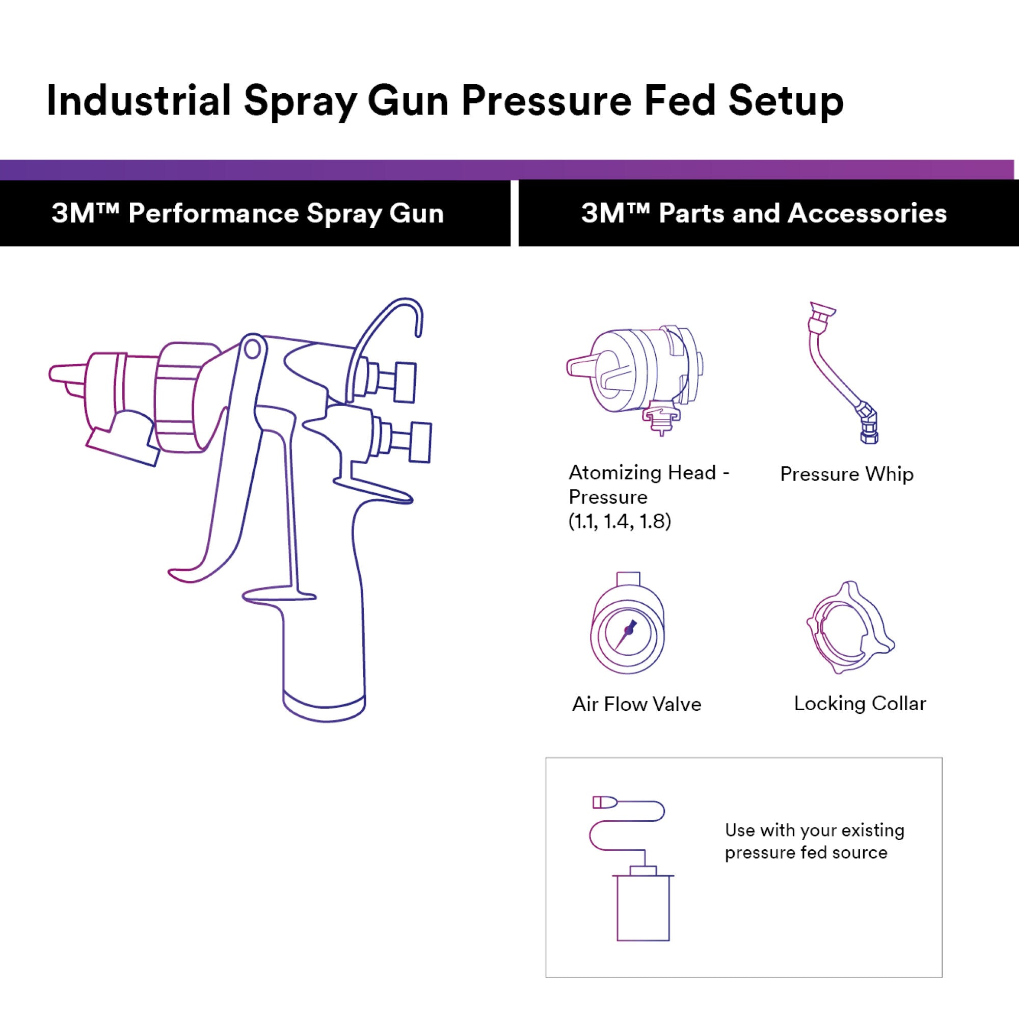 3M™ Performance Pressure HVLP Atomizing Head Variety Refill Kit includes two each of 1.1, 1.4 and 1.8 atomizing heads for spraying a wide range of industrial and automotive coatings, including high-viscosity coatings, sprayable fillers, high-build primers, primer surfacers, sealers, single-stage top coats, solvent-based paints, waterborne paints and clearcoats.