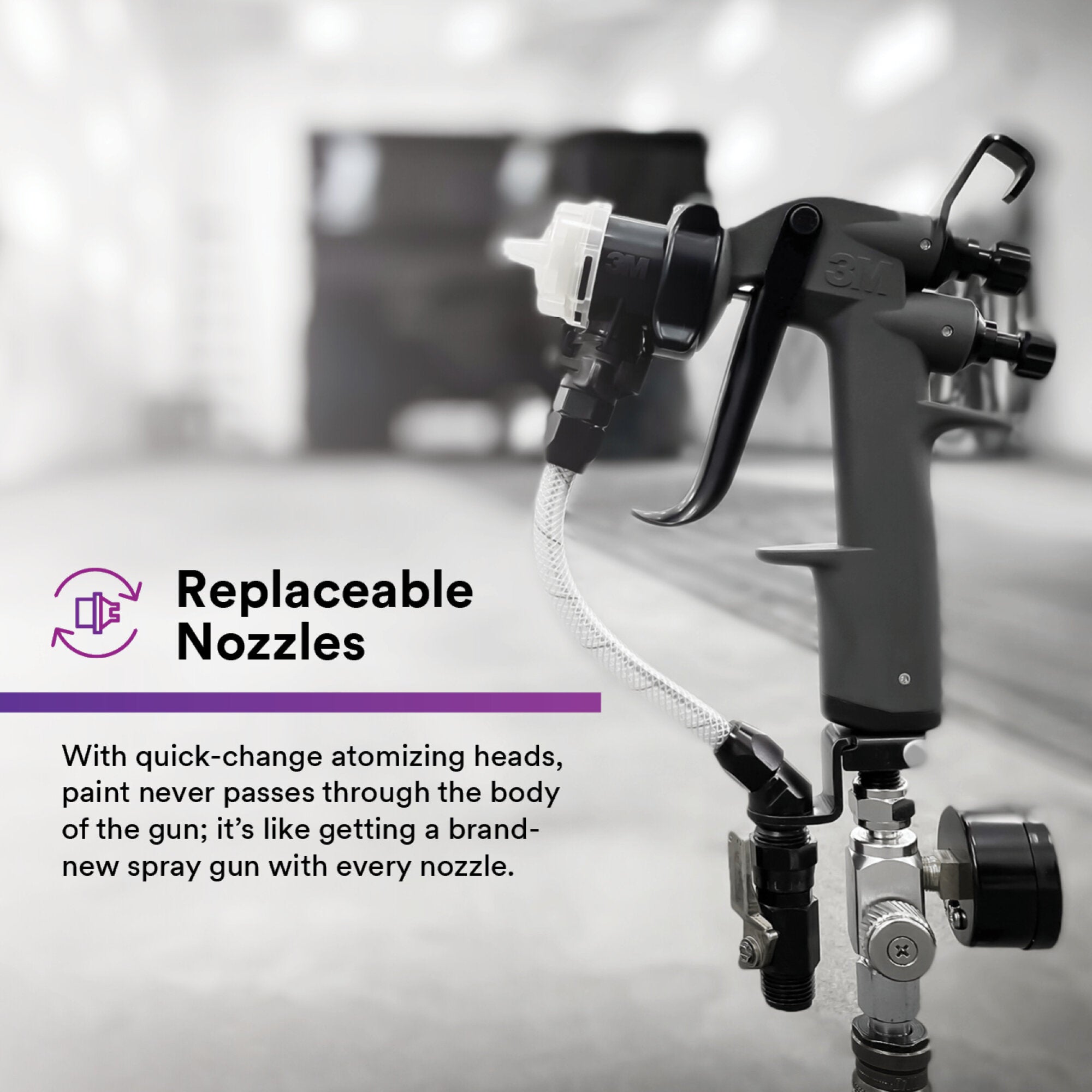 3M Performance Pressure HVLP Atomizing Heads are designed to deliver premium spray performance for coatings including, including stains, primers, base coats, topcoats, clear coats and adhesives. Replaceable nozzles are built exclusively for pressure-feed applications using the 3M Performance Spray Gun, offering like-new spray performance with the change of each nozzle.What makes the 3M™ Performance Spray Gun system different is the technology inside the quick-change replaceable nozzles. Because paint and coatings never pass through the body of the spray gun – and only the atomizing head – it's like getting a brand-new spray gun every time you swap the nozzle. Get the pattern control, atomization and transfer efficiency you expect from a premium spray gun – all while helping to drive more consistent spray performance across each job, every day.