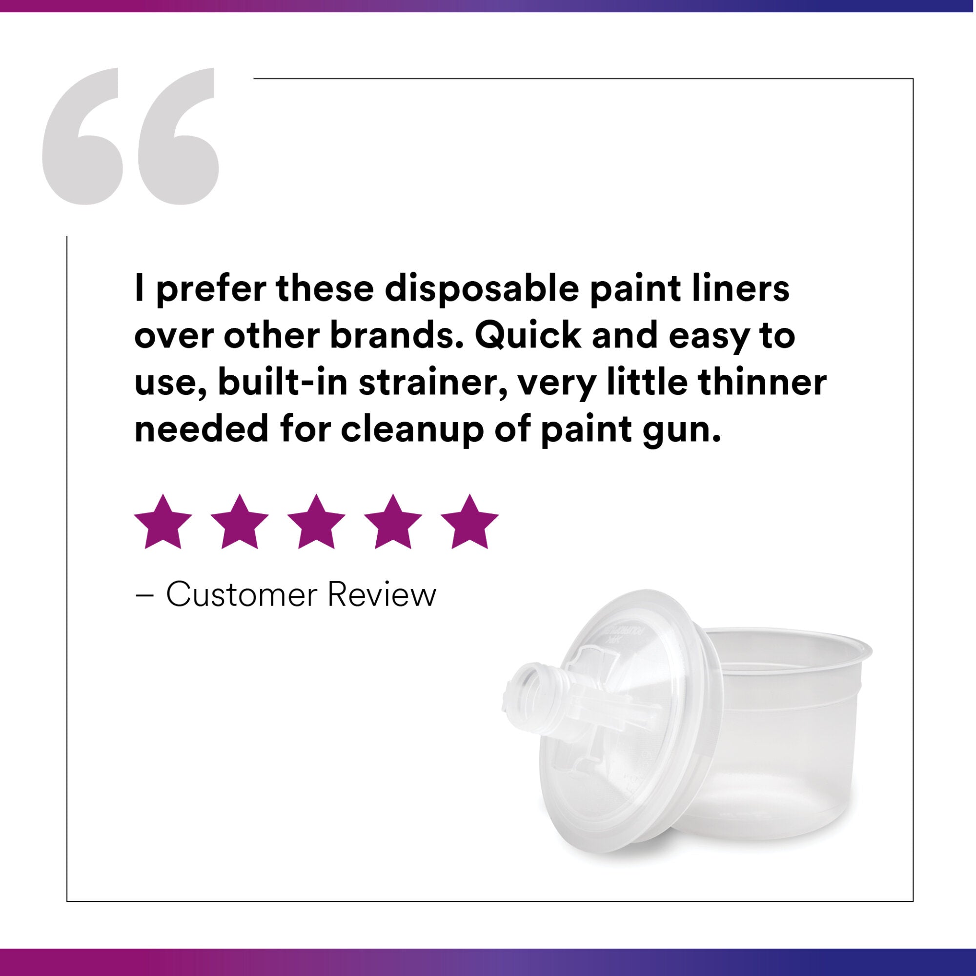 Because the painter uses a new disposable lid (with welded-in filter) and disposable liner for each mix, there is less risk of outside contamination due to mixing, filtering and clean up. Using a fresh lid and liner with each paint job, rather than washing out reusable components often improves overall productivity in prep and clean-up time by as much as 50%.