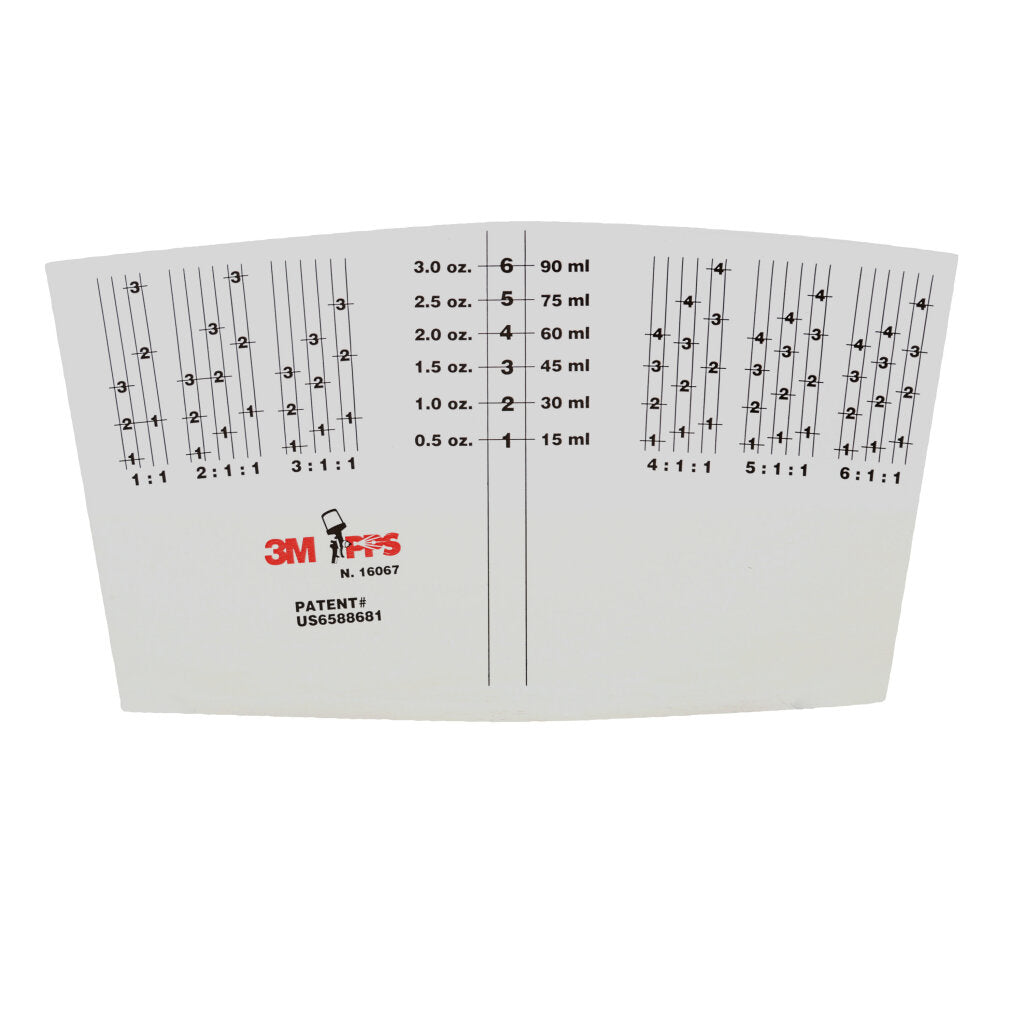 3M™ PPS™ Mix Ratio Inserts make it easy to mix the appropriate amount of paint for use with the 3M™ PPS™ (Legacy) paint preparation system. Mix ratios printed on the film insert take all the guesswork out of how much to use. With the insert in the cup, the measuring process is much like using a metal mix stick. You look down into the cup as ingredients are poured, making it simple to see exactly what you need. We offer a wide variety of ratio inserts customized to specific cup sizes and manufacturers.