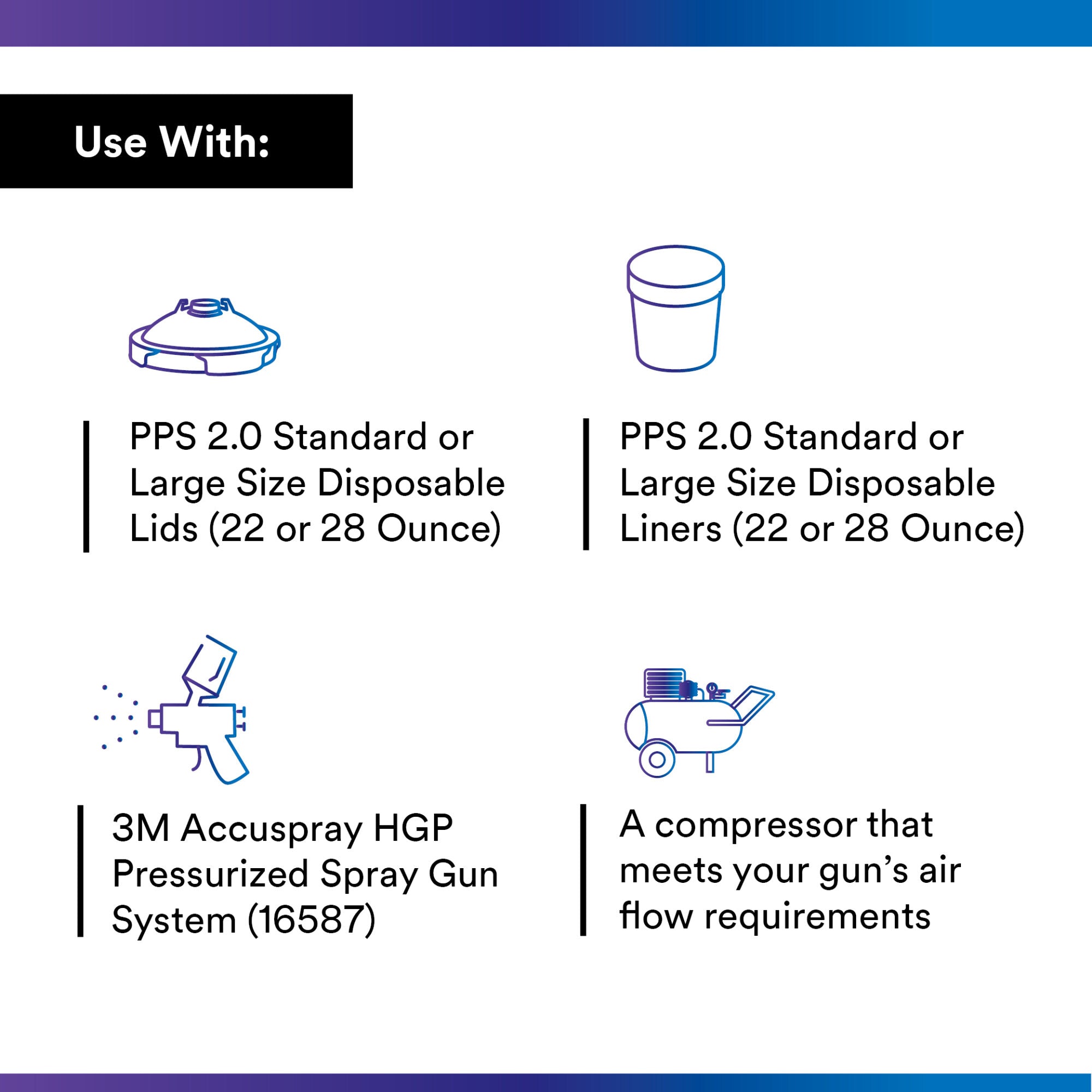 - Pressurized hard cups and collars use with 3M™ PPS™ Series 2.0 spray system