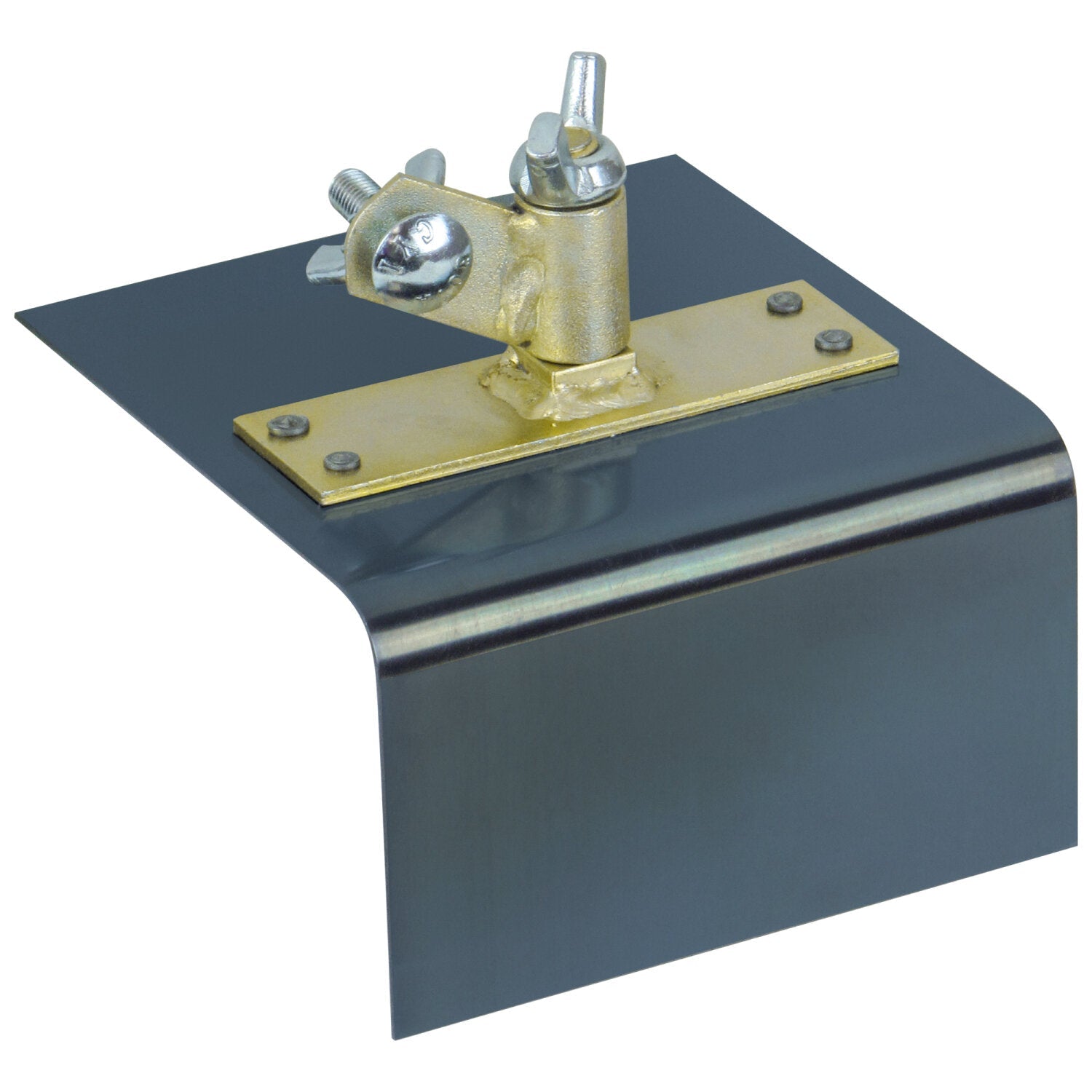 The 6" long blue steel blade moves smoothly along edges of concrete creating inside steps and corners. This step tool creates a 1/2" radius on the edge of concrete slabs preventing the edges from chipping with wear. The lip then extends down 3" forming the front of the step. The 12" square tool provides the perfect amount of coverage on the base for steps, sidewalks and large projects. The tempered crucible spring steel provides the proper amount of "give" for the perfect feel when working on cement. Four rivets secure the steel mounting to the blade. The rivets are ground for a smooth perfect finish. A 360° swivel bracket provides the versatility to let you work from any angle. The wingnut on top tightens the bracket to hold the angle. Use with a Clevis Handle or handle adapters for use with bull float extension handles, all sold separately. Use matching Cove Tool (#CC9080-01) for perfect steps.