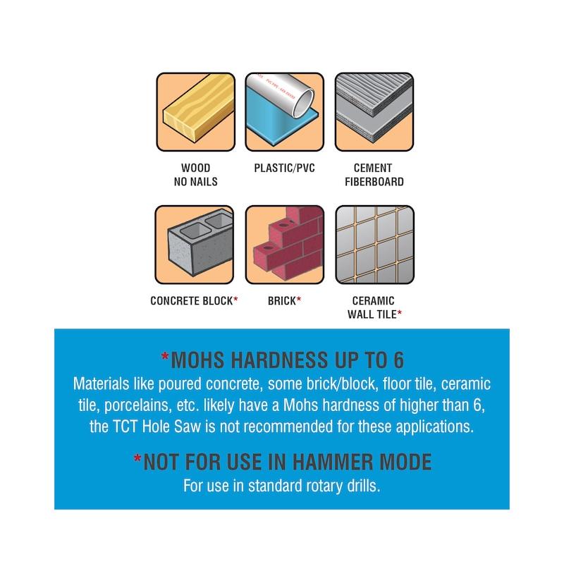 Spyder's Tungsten Carbide Tipped (TCT) hole saws cut more materials (up to 5x faster), last longer (up to 10x more holes), and cut deeper (maximum cut depth of 6-1/4-in) than conventional bi-metal saws. TCT hole saws cut wood, concrete block, brick, fiber cement board, ceramic wall tile, PVC, and more (with a Mohs hardness of less than 6). This extended cutting depth makes Spyder's Deep Cut hole saws excellent for stacked materials, deeper cuts, and for drilling through brick and concrete block. Note: Spyder TCT Deep Cut hole saws use Hex11 arbors/pilots which do not feature Rapid Core Eject technology; they cannot cut at an angle or enlarge existing holes. For use in standard rotary drills. Do not use in hammer drill mode. Not recommended for harder, abrasive materials.