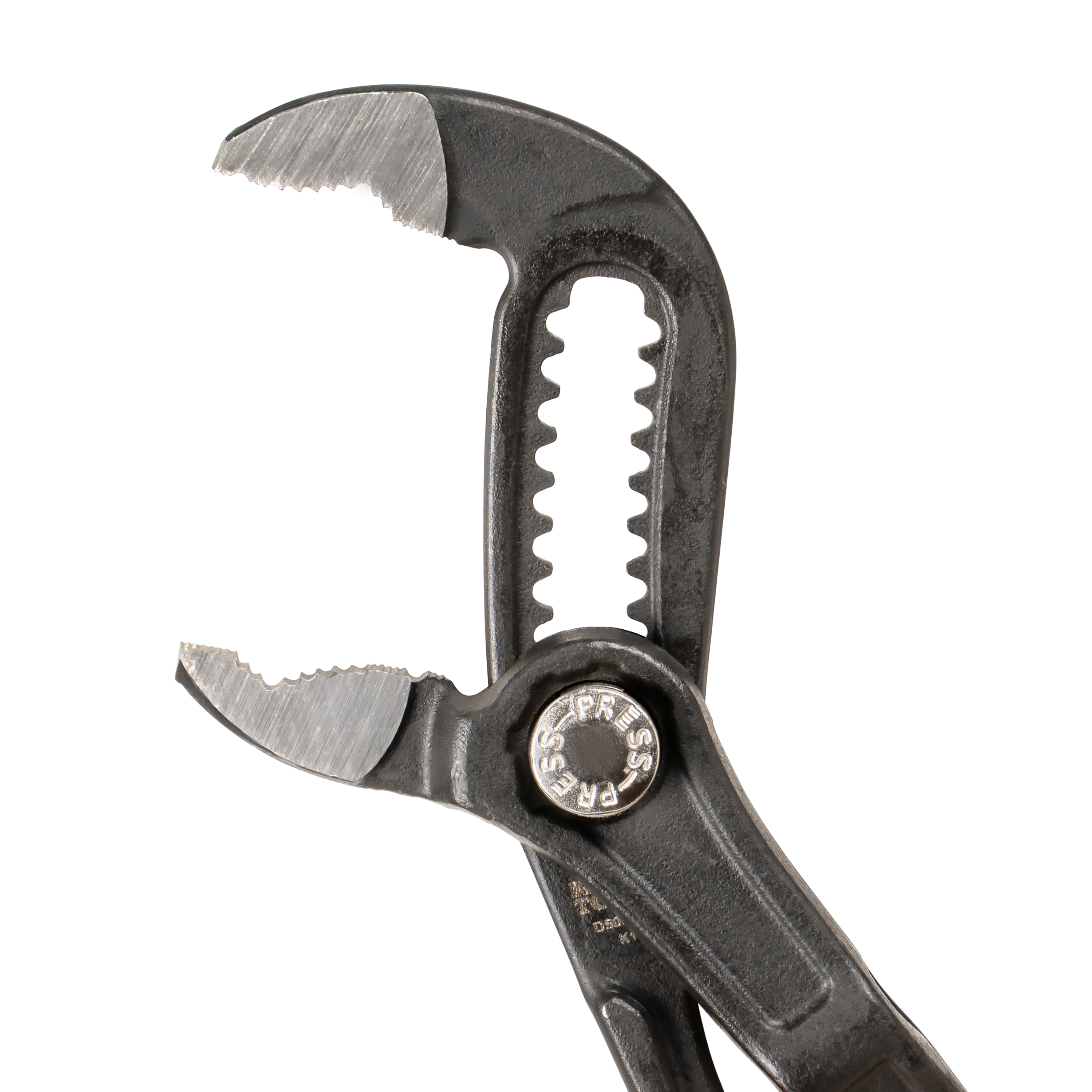 The Klein Quick-Adjust Klaw Pump Pliers feature a unique curved jaw with multiple contact points, delivering maximum torque and a secure grip. The hardened teeth on the jaw's gripping surface minimize wear and provide a strong, positive hold. Its all-steel construction ensures exceptional strength and long-lasting performance, even in the most demanding tasks.