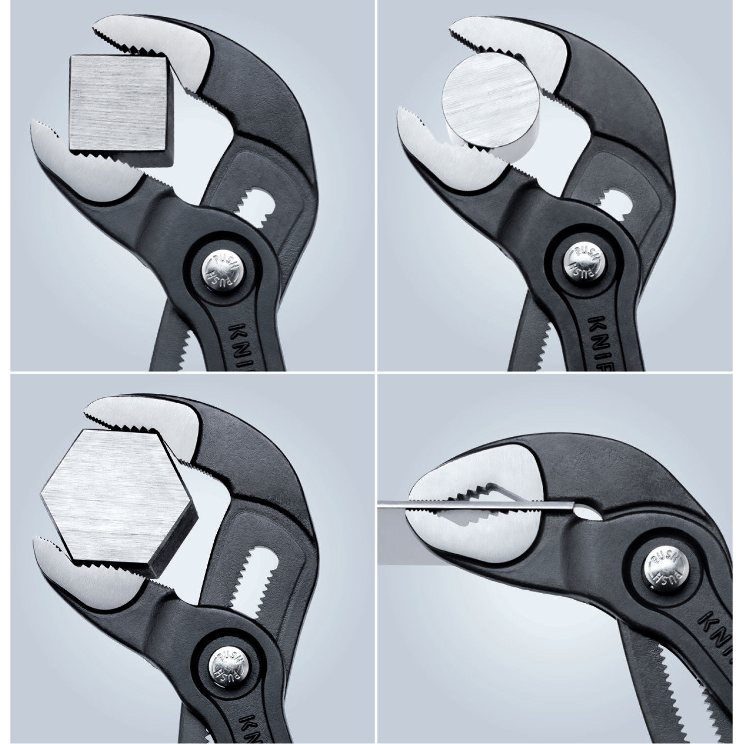 Cobra Water Pump Pliers Adjustment at the touch of a button directly on the workpiece. Fine adjustment for optimum adaptation to different size workpieces and a comfortable gripping position. Self-locking on pipes and nuts: no slipping off the workpiece and low handforce required. Gripping surfaces with special hardened teeth, teeth hardness (approx. 61 HRC): low wear and reliable gripping. Box-joint design: high stability because of double guide. Reliable catching of the hinge bolt: no unintentional shifting. Pinch guard prevents operators' fingers being pinched. 18 adjustment positions. Chrome vanadium electric steel; forged, multi-stage oil-hardened.