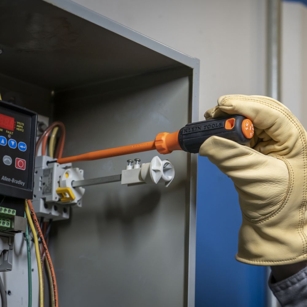 - 1000V rated screwdriver features a layer of bright orange impact and flame resistant insulation to protect from electrical shock
