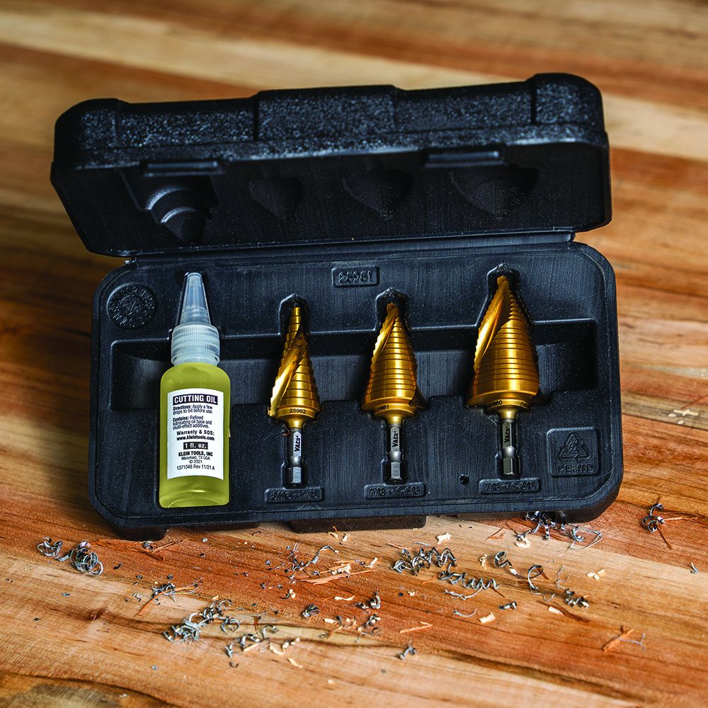 Three bit sizes for 17 different sized holes - 3/16” to 7/8”, 7/8” to 1 1/8”, and 7/8” to 1 3/8”. Double-fluted step bits made under Klein’s “Vaco” brand help drill commonly needed hole sizes!