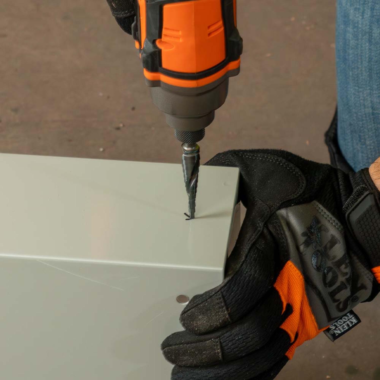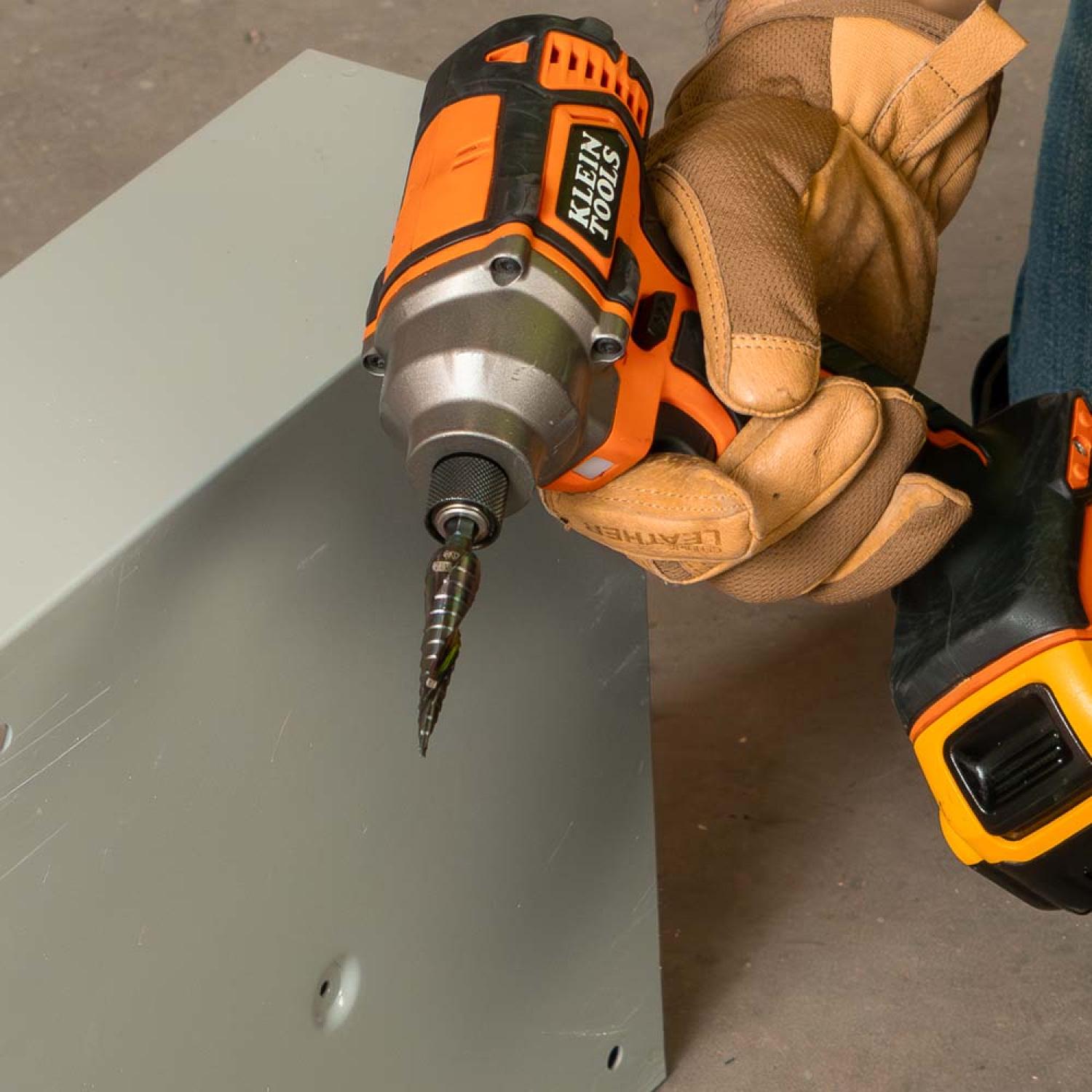 The dual spiral flutes on Klein Step Drill Bits help pull the step bit through the material for faster cutting. The aluminum titanium coating is 10 times more durable than steamed black oxide for longer bit life. Impact rated, the 1/4-Inch hex shank provides a firm, positive grip and allows quick and convenient usage with an impact driver and a drill. Thirteen hole sizes with laser marking for easy identification.