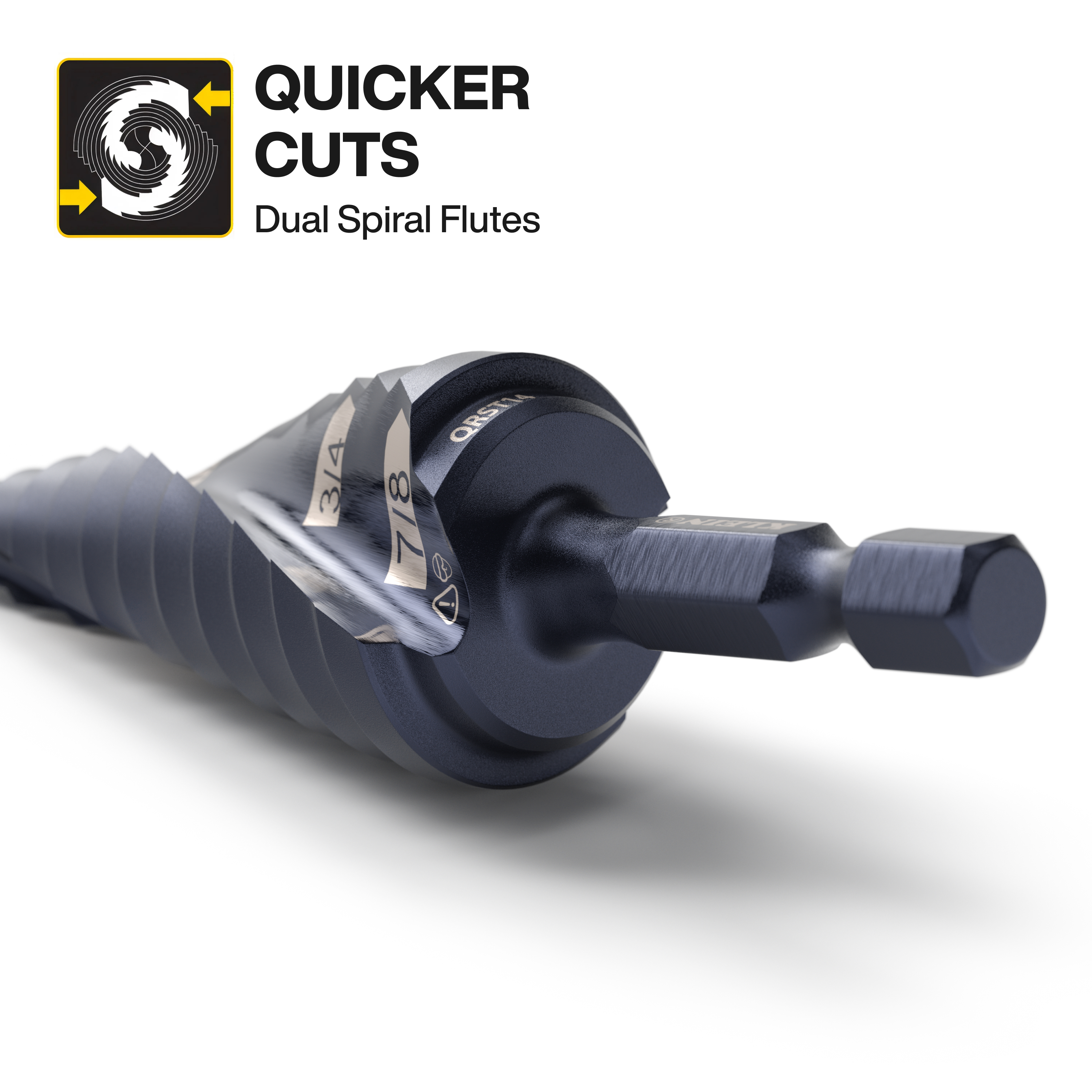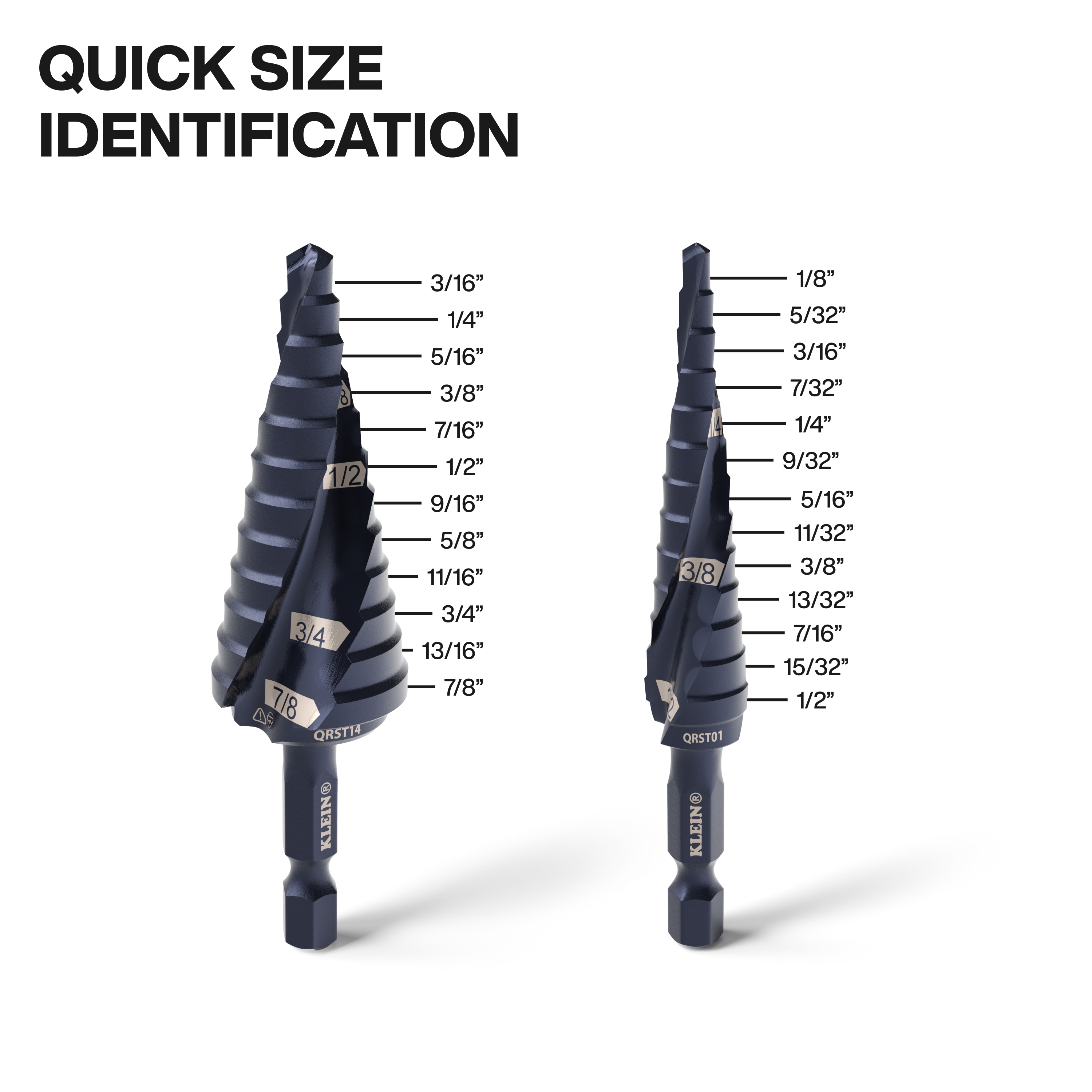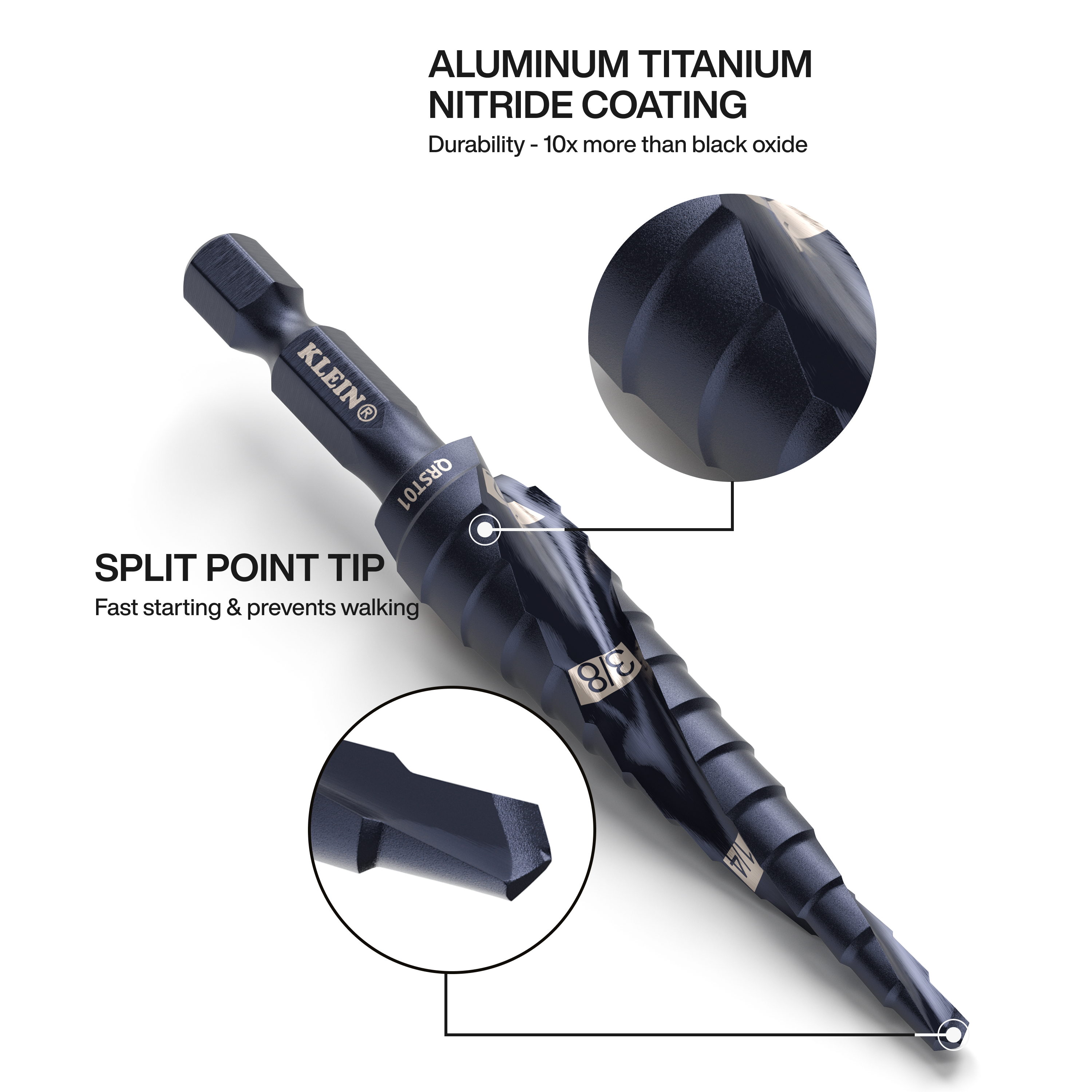 The dual spiral flutes on Klein Step Drill Bits help pull the step bit through the material for faster cutting. The aluminum titanium coating is 10 times more durable than steamed black oxide for longer bit life. The 1/4-Inch hex shank is impact-rated, providing a firm, positive grip that allows for quick and convenient usage with an impact driver and drill. Up to thirteen hole sizes with laser marking for easy identification.