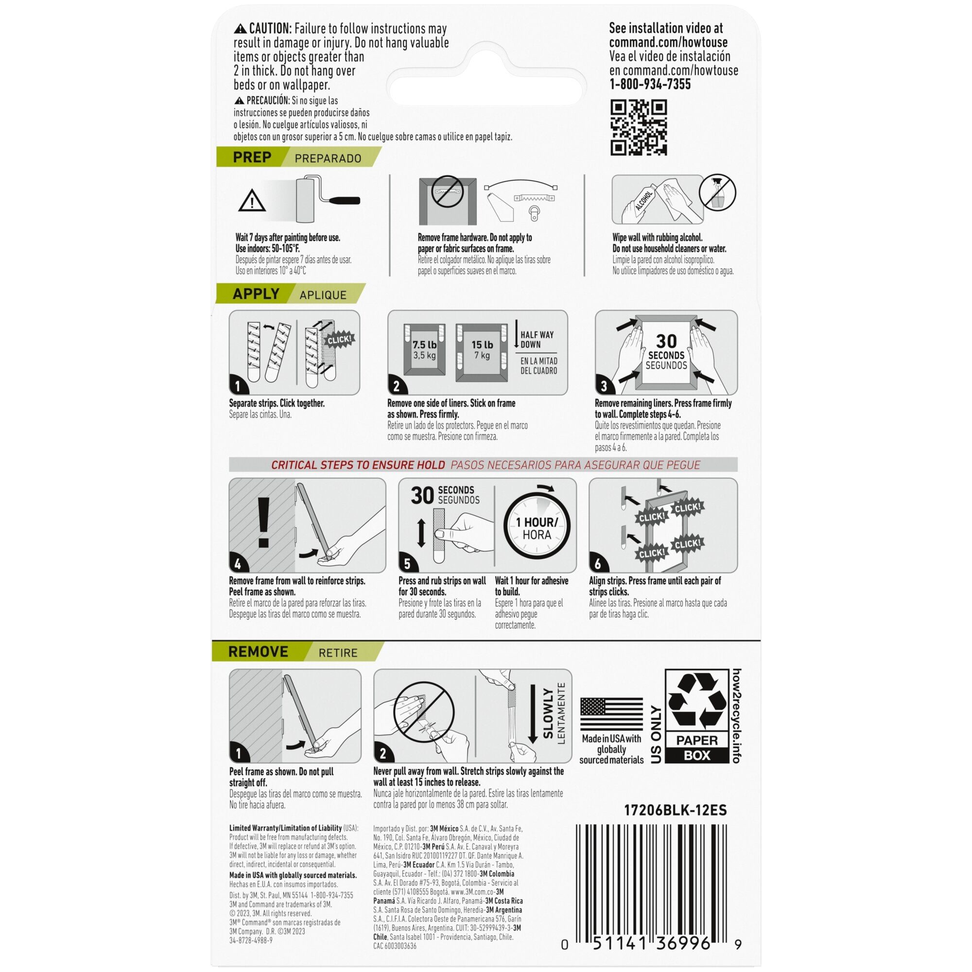 • INCLUDES- 12 Pairs of 15 lb Black Command Picture Hanging Strips (24 Strips total); 4 Pairs hold 15 lbs. Maximum frame size of 24 inches x 36 inches