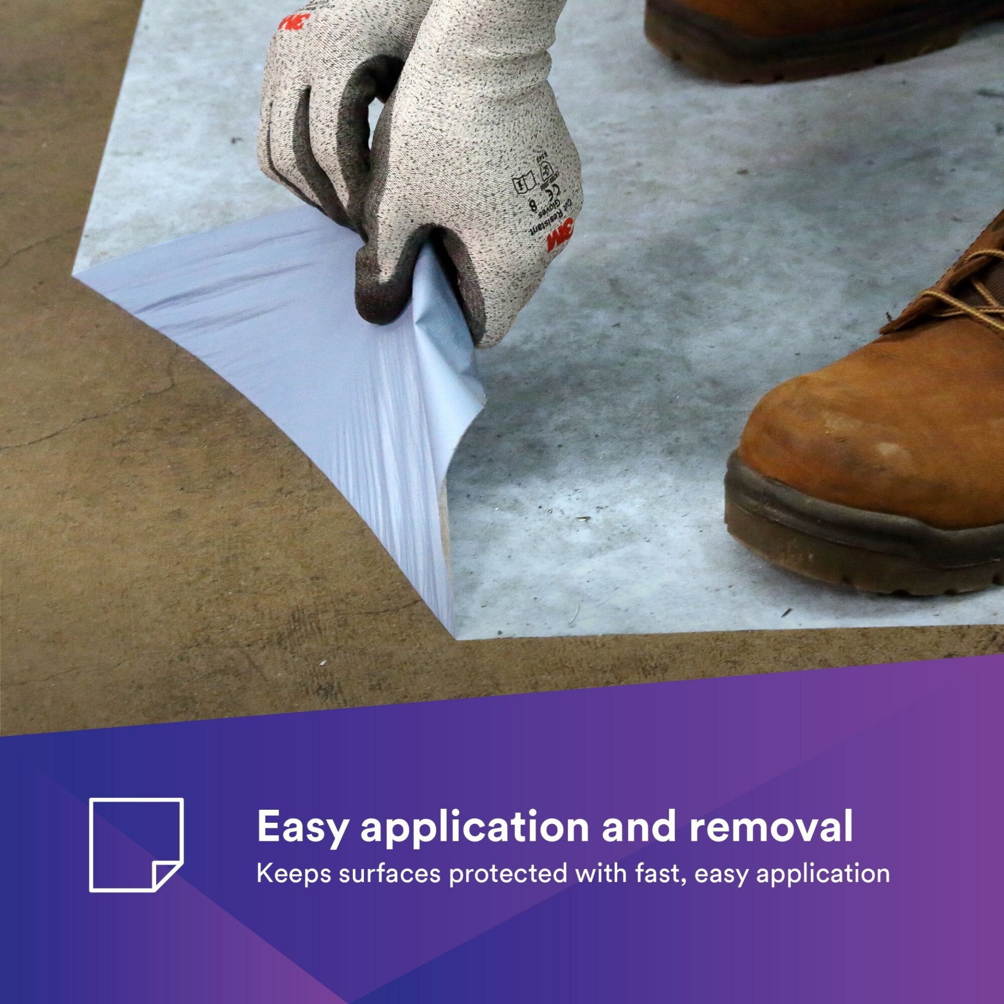 This makes 3M™ Self-Stick Liquid Protection Fabric an excellent replacement for traditional time-consuming paper-and-tape or plastic-and-tape masking processes. Because the material stays firmly in place, it protects surfaces from micro-scratches which can occur when masking material moves around over time. Its nonwoven surface material has been shown to provide extra traction when applied to smooth surfaces. The material also can help reduce pooling by trapping liquid just below the surface, without allowing it to soak through to the floor. Also, its low-tack adhesive backing makes it much less likely to slide on bare floors vs. masking paper or plastic sheeting.