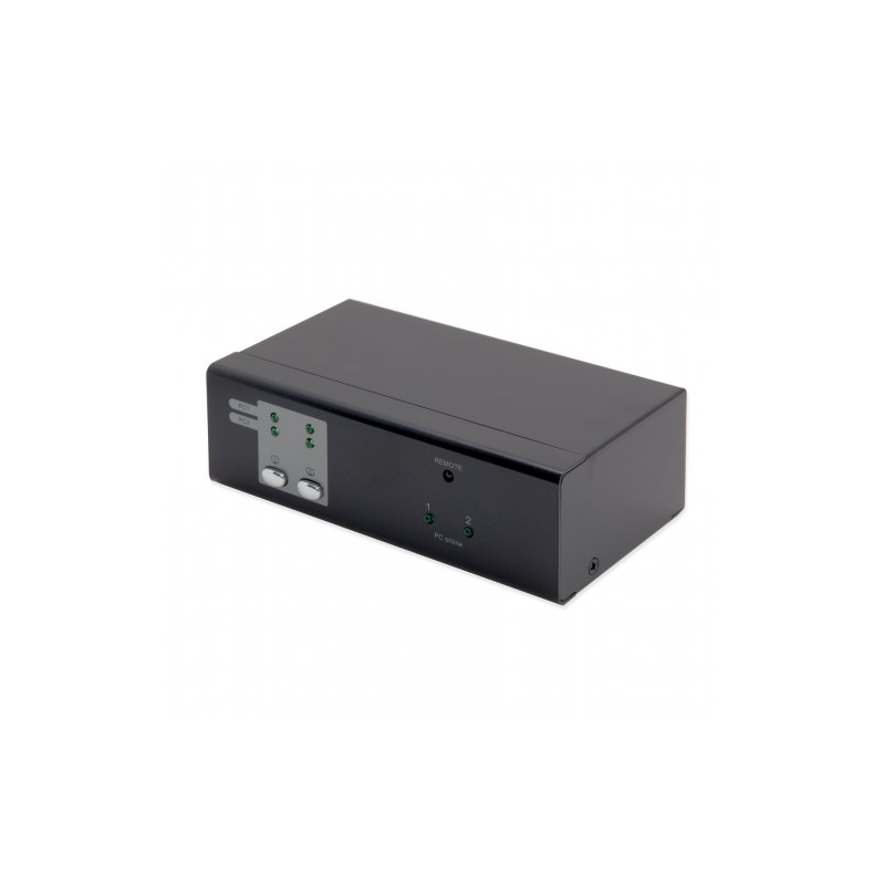 The Syba 2x2 VGA-Audio Matrix Switch (w/ Remote Control) allows you to display up to two computer's video inputs on two monitors or projectors. With remote-control and built-in video signal enhancement for cables up to 210 feet, this KVM switch is suited for classroom, hall, or office settings.