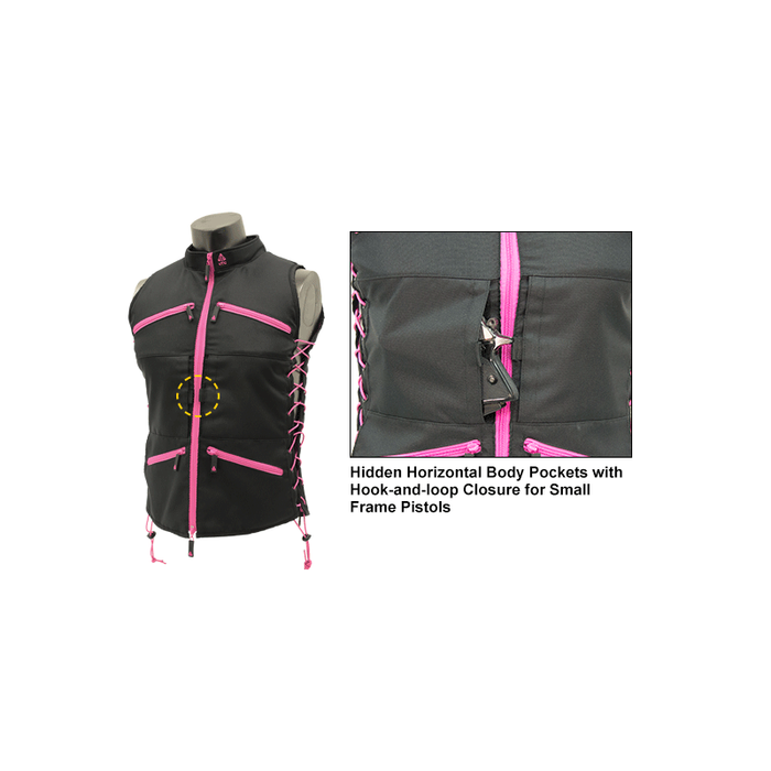 • Front Outside Pockets - 2 Zippered Chest Pockets for Smart Phone, Protective Glasses and Ear Plugs; 2 Hidden Horizontal Body Pockets with Hook-and-loop Closure for Small Frame Pistols