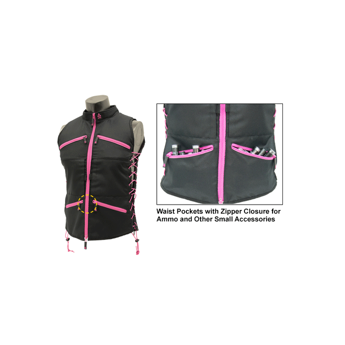 • 2 Zippered Waist Pockets for Ammo. Front Inside Pockets - Chest Pockets with Hook-and-loop Closure, Complete with Cut-to-Fit Pads for Recoil Protection