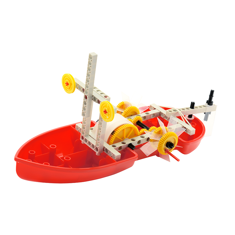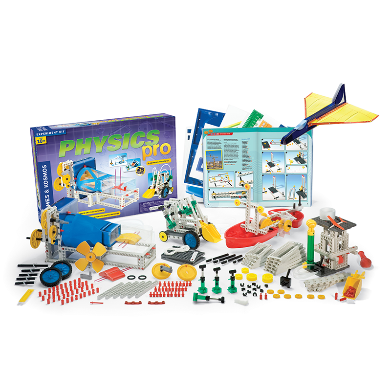 Physics Pro V2.0: Advanced Physics Kit. Physics Pro is our biggest, most advanced physics kit. With this kit, you can continue your study of statics and dynamics from previous lessons and begin your study of more advanced topics in physics, including fluid dynamics, energy, oscillation, hydraulics and pneumatics. By adding advanced topics like fluid dynamics to your physics repertoire, you can now build some really spectacular models and devices, such as a wind tunnel, pneumatic shocks and a hydraulic lift. You will see how physics extends far beyond the classroom, giving us an amazing set of tools that can be applied in the real world to engineer marvelous things. The main focus of the kit is the behavior of the two most important fluids in our world - water and air - and objects immersed in them. You will investigate how air and water rest and flow, what they can carry and how they move. With experiments and models, you will find out what forces work on them and what kinds of energy they possess. You will learn how ships float and airplanes fly, why a streamlined shape lets a car drive faster and how power plants convert a current of water into electrical current. The 96-page, full-color experiment manual has two major sections. In the first part, you will enter the physics lab, where you will get to know the properties of air and water and become familiar with currents and energy. There is a series of 17 experiments in which you will stat building smaller models. in the second part, you will move on to the workshop, where you will build 14 larger models of complex real-world devices. More than 213 parts are included in this kit, which are compatible with all of our other Physics kits.