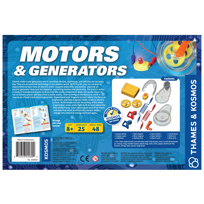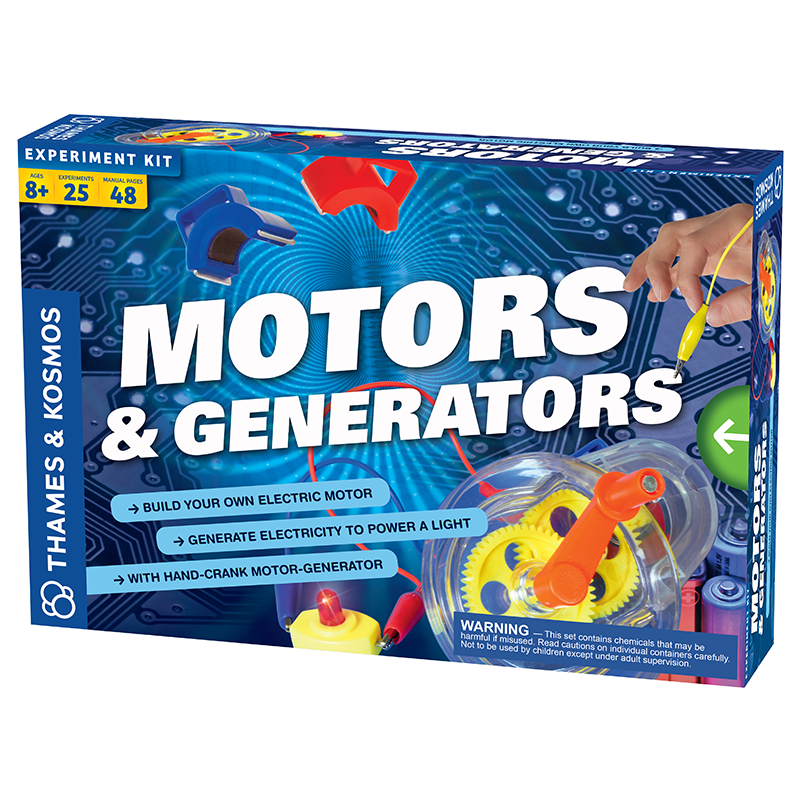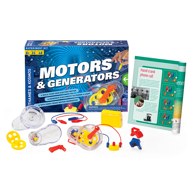 Electric motors and generators are in countless devices, appliances, and vehicles we use every day. They are an essential technology in our modern world. With this kit, you can conduct 25 experiments to learn how an electric motor converts electricity into motion, and how an electric generator does just the opposite, converting motion into electricity. The electric motor is made of transparent plastic to show how the inside components work. Set up the motor to run on battery power and learn how a motor works. Then reconfigure the device to work in reverse as a hand-crank electric generator. Experiment with magnets to learn about the force of magnetism, and how magnetic fields relate to electric current. Build simple circuits consisting of the motor or generator, wires, and a light bulb to learn about the flow of electricity. Learn about gears and drive-trains and how they work to effectively convert kinetic energy into electrical energy and back again. The full-color, 48-page manual guides your experiments with step-by-step instructions.