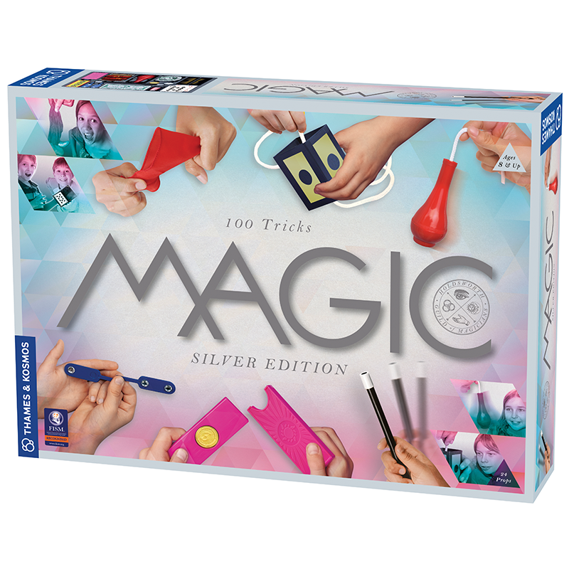 Grab your wand! With high-quality magic props and simple illustrated instructions, the 100 magic tricks in this kit can be easily learned, practiced, and mastered - to stun and amaze audiences! Dots appear and disappear in paddle tricks. Make playing cards come and go and change places. In tricks with money, currency loses value, money doubles in value, and coins disappear from a coin box and then reappear. Coins pass through handkerchiefs, disappear into thin air, and magically stay put when they shouldn't! Paper money disappears and milk appears out of nowhere in tricks with tubes. A number of tricks involve knots and ropes: Knots in ropes untie themselves, jump from rope to rope, and disappear. A rope passes through solid objects. A bottle floats in the air. A rigid magic wand becomes flexible. A magic wand grows and shrinks, passes through objects, and emerges from an empty bag. The magic wand twists and levitates. Invisible forces move the wand. The wand tells time. Many tricks can be done with your hands and a magical thumb: A silk pocket square appears out of nowhere, coins get pulverized, objects magically stay dry, salt vanishes, sugar appears, loose sugar becomes a sugar cube, and dollar bills emerge from bread rolls. Fun hanky tricks will have a piece of fabric appearing, disappearing, and getting knotted and unknotted. In food tricks, salt and pepper separate, oranges become apples, and sugar and spice don't play very nice! Even everyday household objects get in on the action: Paperclips, pencils, thread, crayons, newspapers, and spoons take part in wild illusions. You will guess people's ages and hypnotize their arms. A 72-page instruction manual with color photographs illustrates how the tricks are performed. Video tutorials for the tricks are available online. For one magician, ages 8 and up, and many audience members.