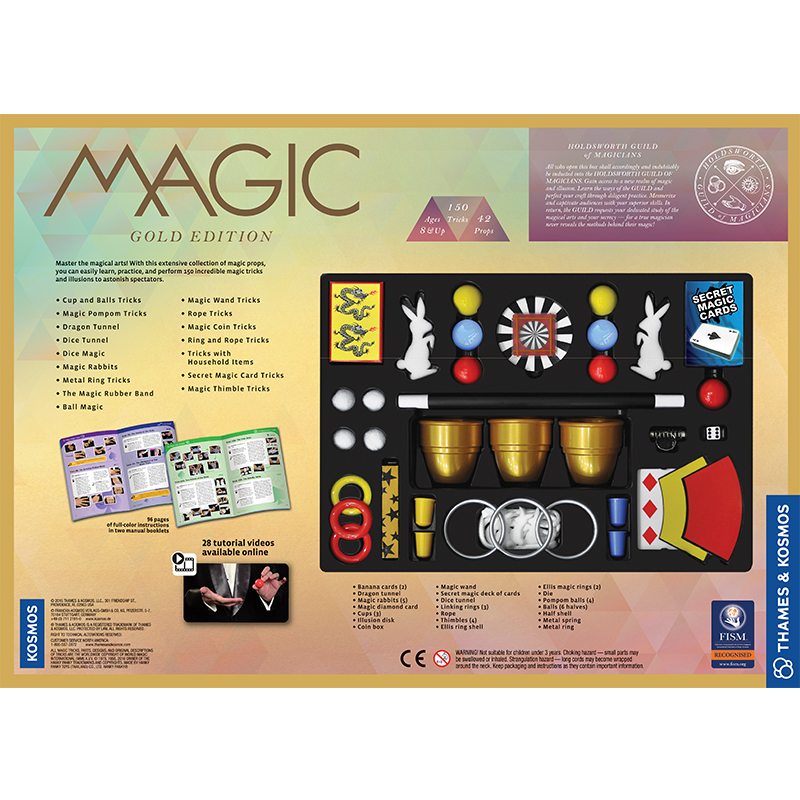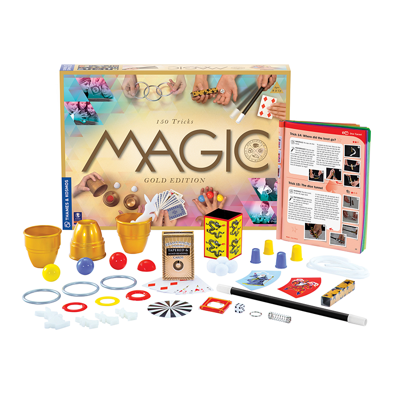 Master the magical arts! With this extensive collection of magic props, you can easily learn, practice, and perform 150 incredible magic tricks and illusions to astonish spectators. In tricks using cups and balls, balls disappear, appear, and change places inside moving cups. Cotton balls transport themselves from hand to pocket and from hand to hand. In tricks with a tube, confetti and snow appear out of nowhere and dice and knots appear and disappear. A six-sided die baffles the mind and fools the eye. Little rabbit shapes appear, disappear, multiply, and hop around. Metal rings move around, link up, and unlink again. Seemingly simple balls aren’t so simple: They appear, disappear, multiply, balance, change places, change colors, and altogether bewilder your audience. A magic wand loses its rigidity, floats in the air, and lets a rope pass right through it. Knots in ropes appear and disappear, a rope gets cut but stays intact, and a rope is pulled out of your mouth! Learn a wide variety of rope and plastic ring illusions.