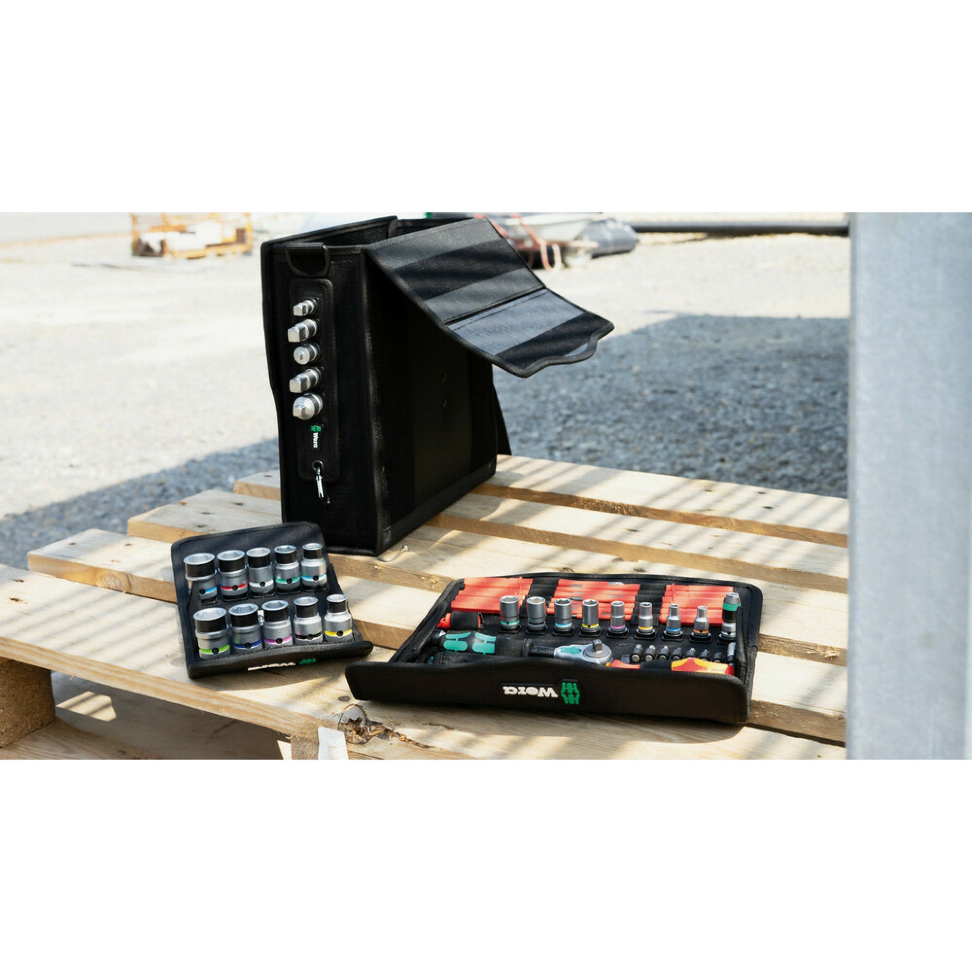 Compact tool set with the most important screwdriving tools for maintenance jobs both indoors as well as outdoors. VDE hand holder including 12 VDE blades; 1 Kraftform series 300 screwdriver for slotted screws; 1 Joker ratcheting combination wrench with holding function, limit stop, small return angle and extremely high-grip toothing; incl. the incredibly fast 1/4" Zyklop Speed ratchet with accessories; 8 Zyklop manual and power tool sockets, 1 universal bit holder; 7 25mm bits; 1 screw gripper to firmly hold screws; textile box that is very robust and durable; can be positioned upright in the workshop shelf for tidy storage; additional surface protection thanks to the textile outer material; low weight and volume for simplified mobility.