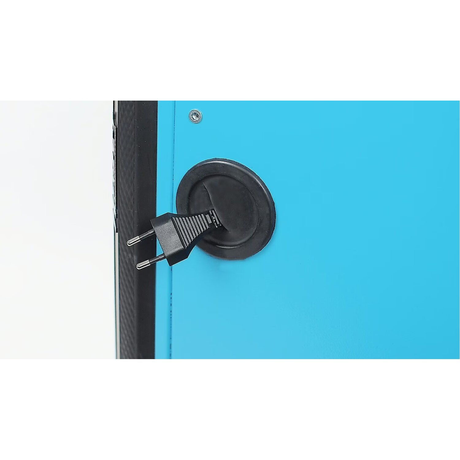 Cable aperture on rear panel allows, for example battery-powered devices to be charged when the door is locked