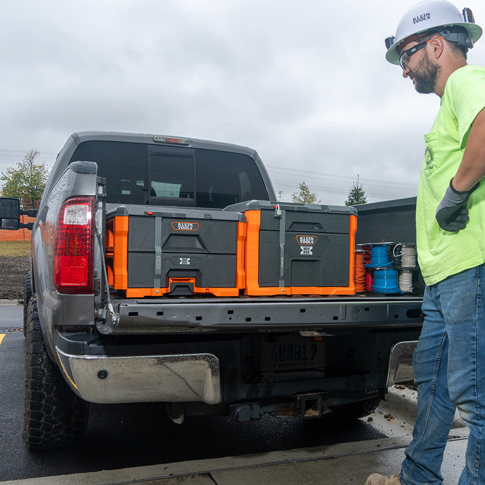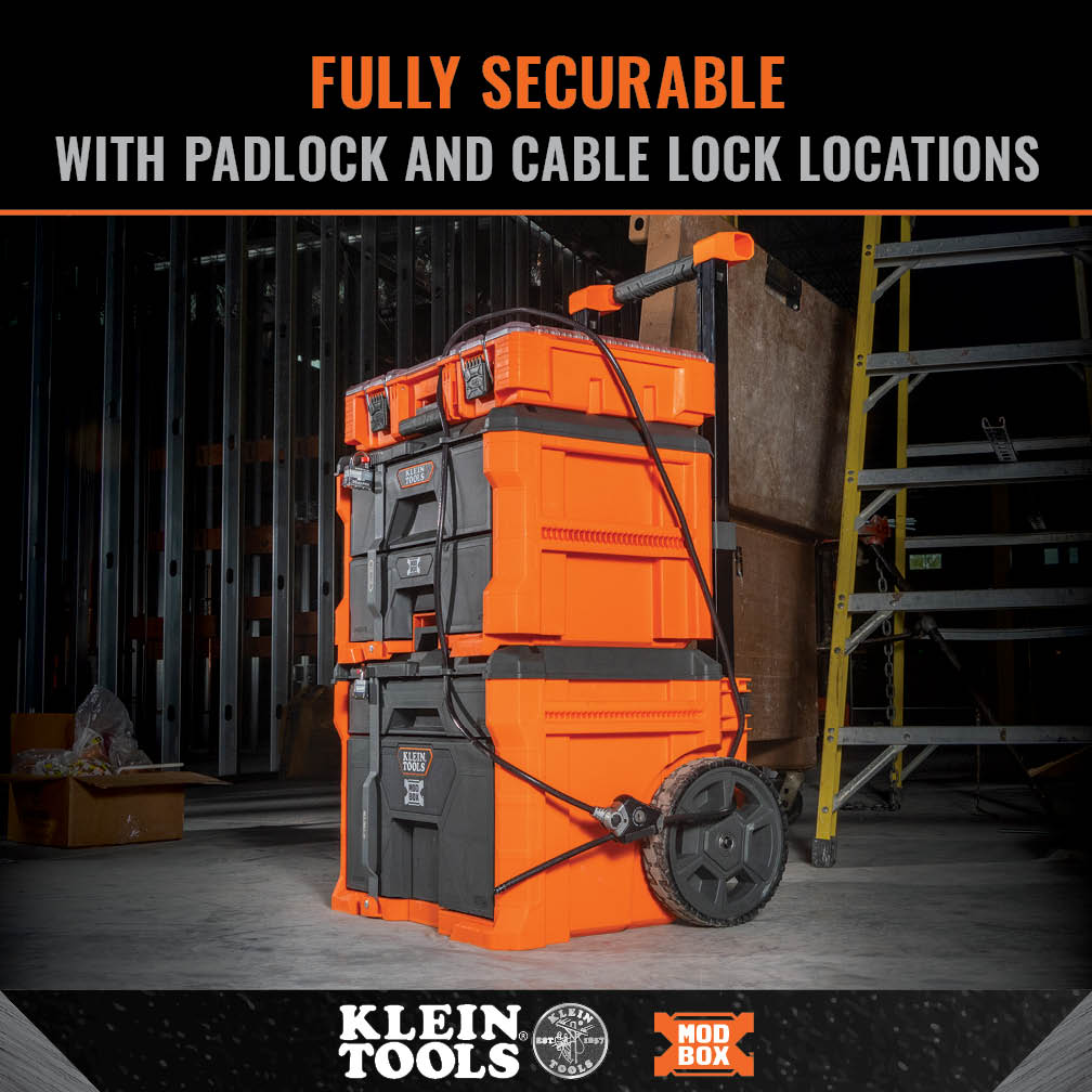 Klein Tools MODbox Rolling Drawer Box features accessible drawers so you can stay stacked. It features a large-capacity lower drawer and compact top drawer. Locking bar secures the drawers in transport. Drawers have removable dividers and heavy-duty ball-bearing slides for smooth operation. With 10-Inch solid rubber wheels, a removable handle, this durable rolling drawer box supports up to 250 pounds (113.4 kg). Easily connects with MODbox components for a custom mobile workstation.