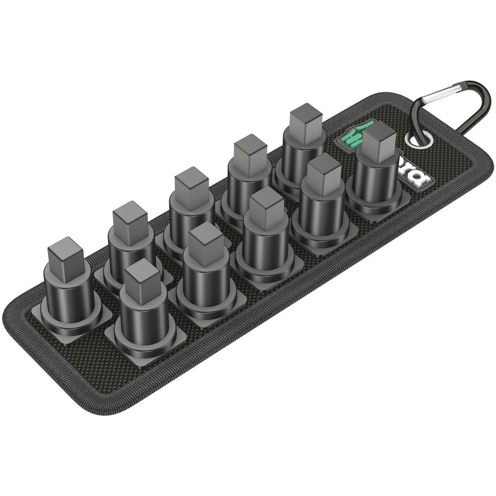 Robust textile belt in the typical Wera design for up to 10 VDE sockets (⅜") in the tightest of spaces. A smooth Smooth Twist to Unlock mechanism ensures a secure grip and easy removal of the sockets. Including snap hooks for attaching to belt loops or bags. Fleece back and hook and loop fastener strips for easy attachment e.g. to wall, shelf, workshop trolley and Wera 2go tool transport system.