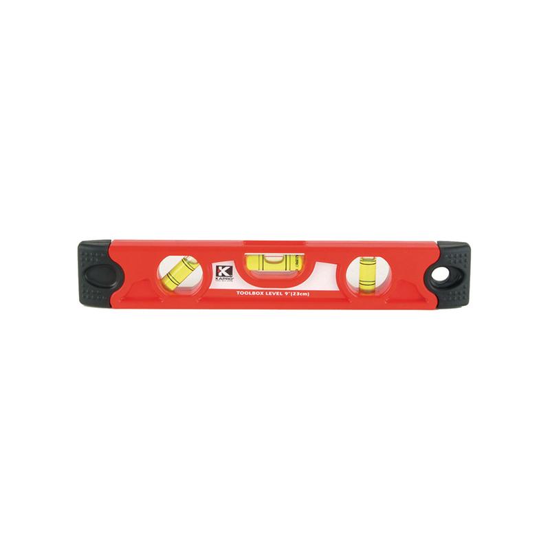 The Kapro 227 Torpedo Toolbox Level features 3 Cylindrical vials including horizontal, vertical, and 45° angle for quick and easy leveling. This magnetic torpedo level is 9 inches long and designed with a V-groove for use on pipe/conduit. Its rubber end caps add extra durability.