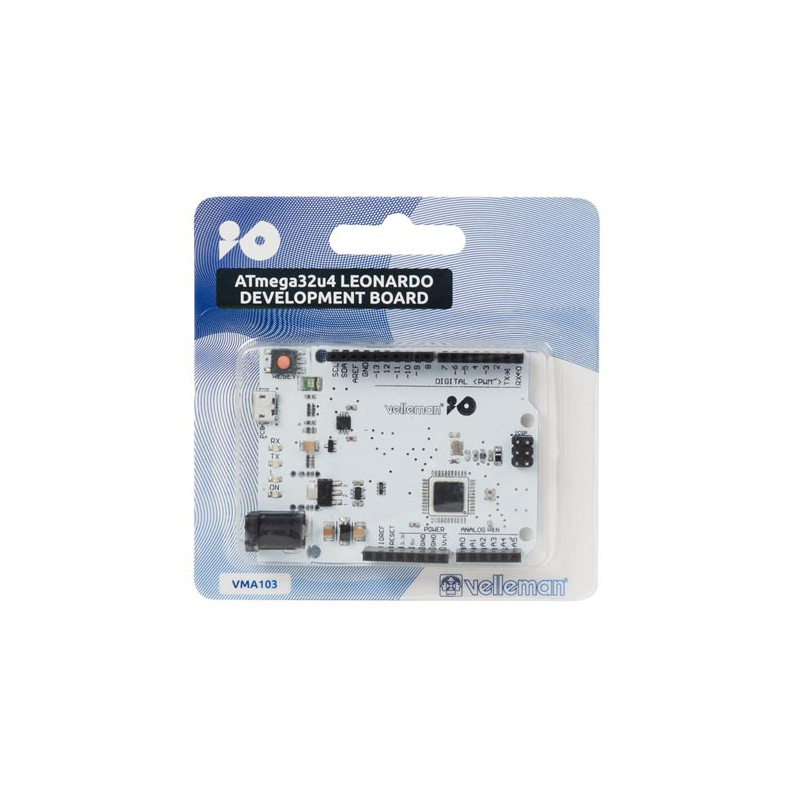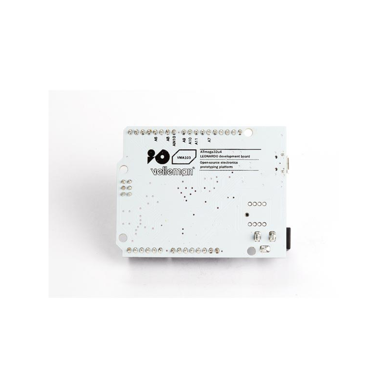 The VMA103 (Arduino® Compatible leonardo) is a microcontroller board based on the ATmega32u4. It has 20 digital input/output pins (of which 7 can be used as PWM outputs and 12 as analog inputs), a 16 MHz crystal oscillator, a micro USB connection, a power jack, an ICSP header, and a reset button. It contains everything needed to support the microcontroller; connect it to a computer with a USB cable or power it with a AC-to-DC adapter or battery to get started.