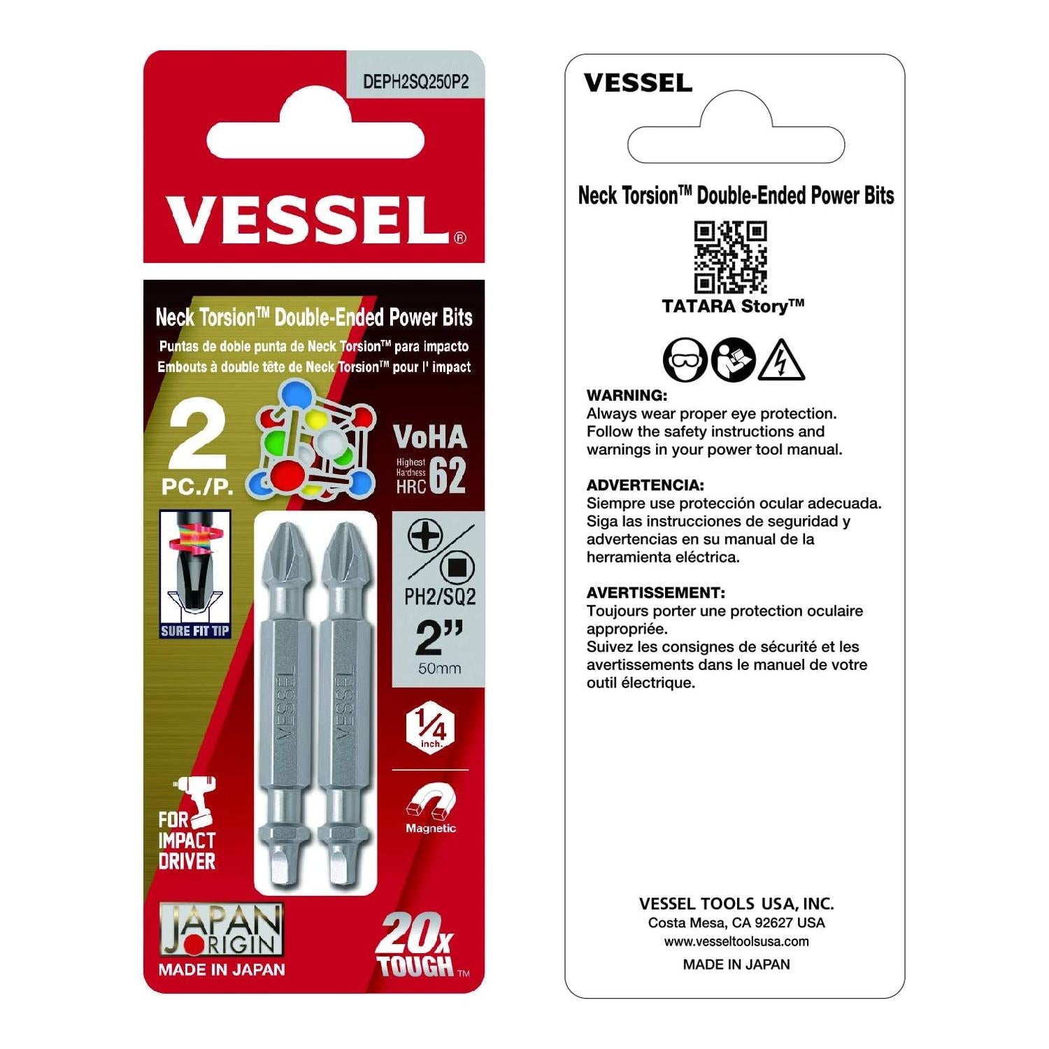 Vessel Tools DEPH2SQ250P2 Neck Torsion Double-Ended Power Bits, PH2 x SQ2 x 50 mm, 2 Pc.