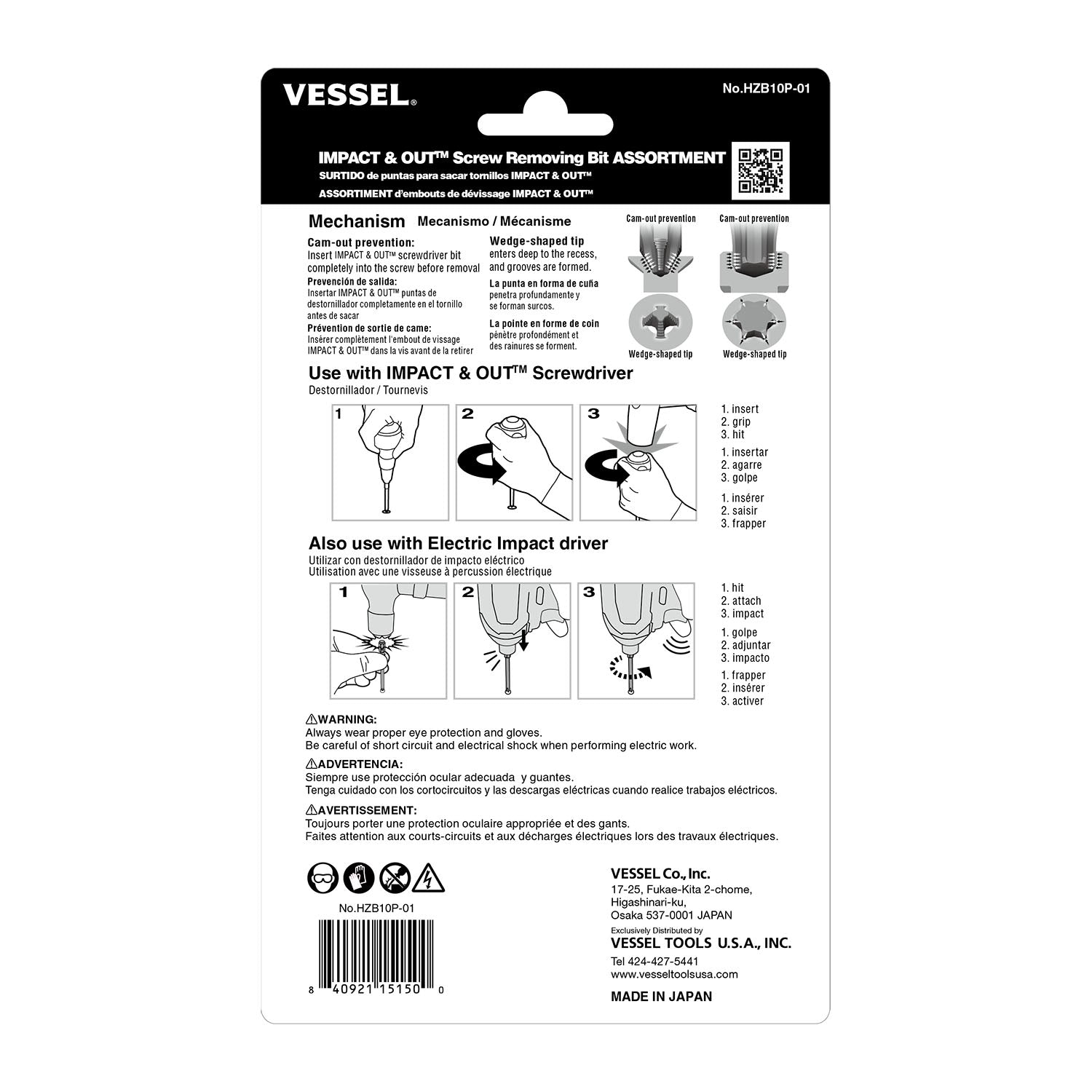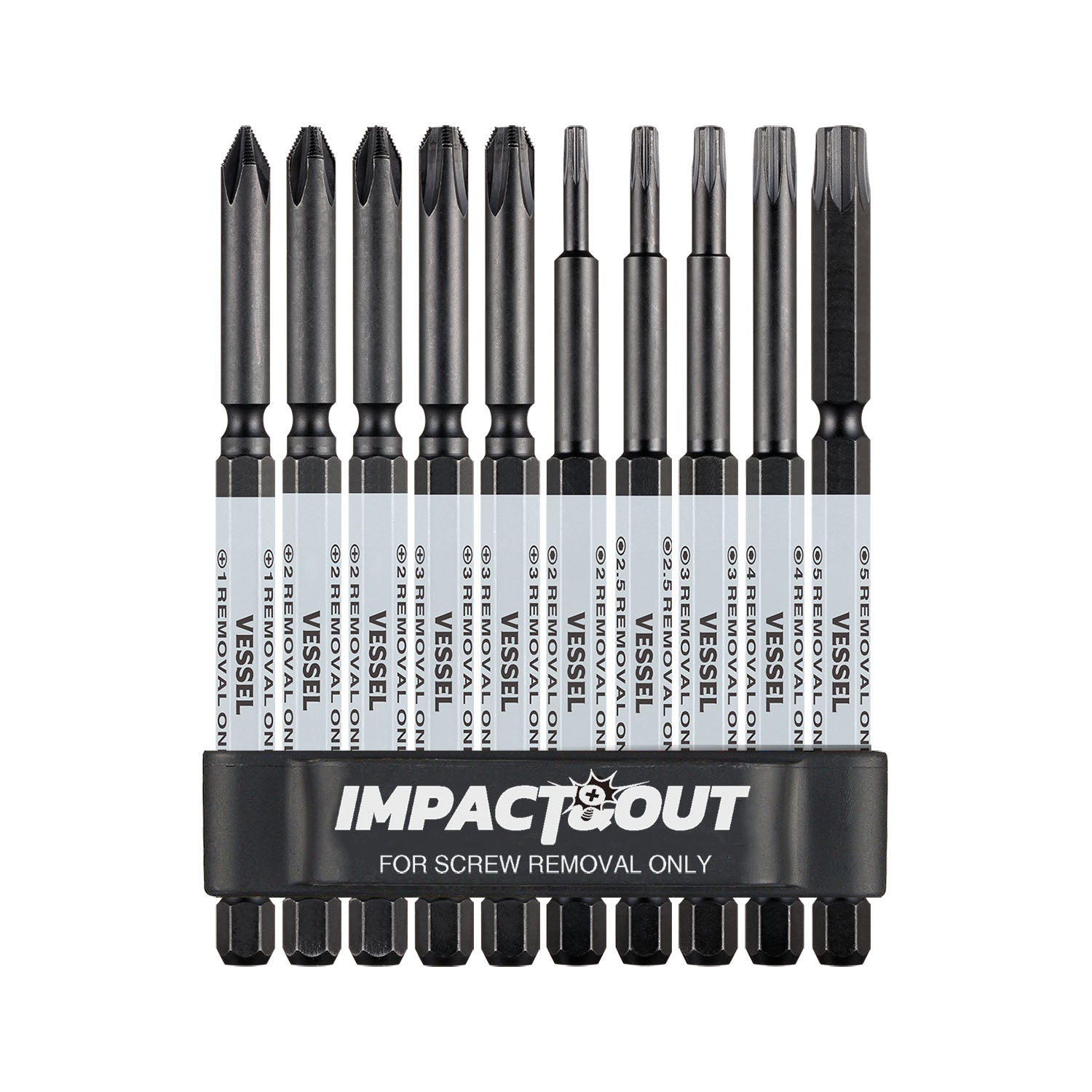 Introducing Vessel Tools HZB10P01 Impact & Out Screw Removing Bit Assortment, equipped with 10 specially designed bits for removing stuck screws. With its newly developed tip-end and wedge-shaped tip, it prevents cam-outs and can be used with an electric impact driver, making screw removal a breeze.