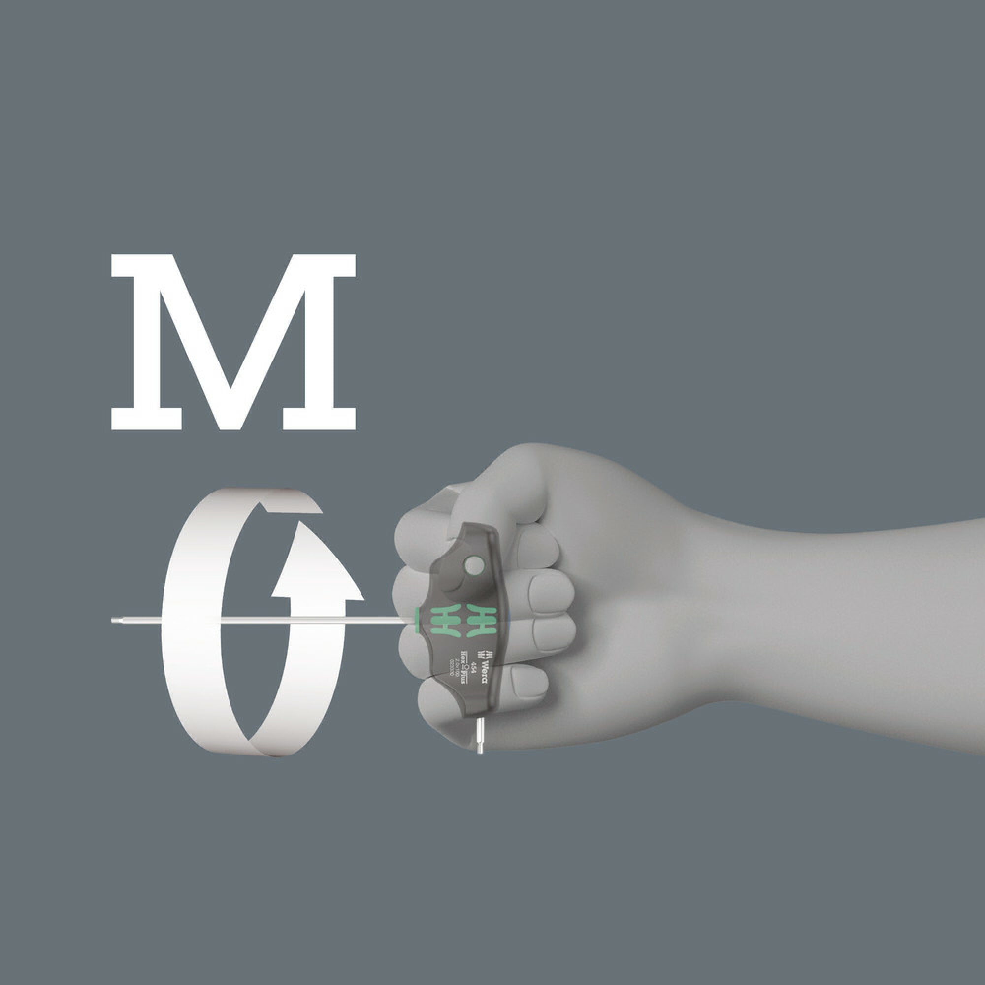 T-handle screwdriver: The ideal handle shape to allow high torque transmission in difficult tightening and loosening situations. The ergonomic shape of the handle fills the palm of the hand well, the fingers lie safely in the soft rounded handle recesses. The whole hand makes contact with the handle and friction losses between the hand and the handle are avoided. Special surface treatment of the blades for high corrosion protection and an optimum fit in the screw head.