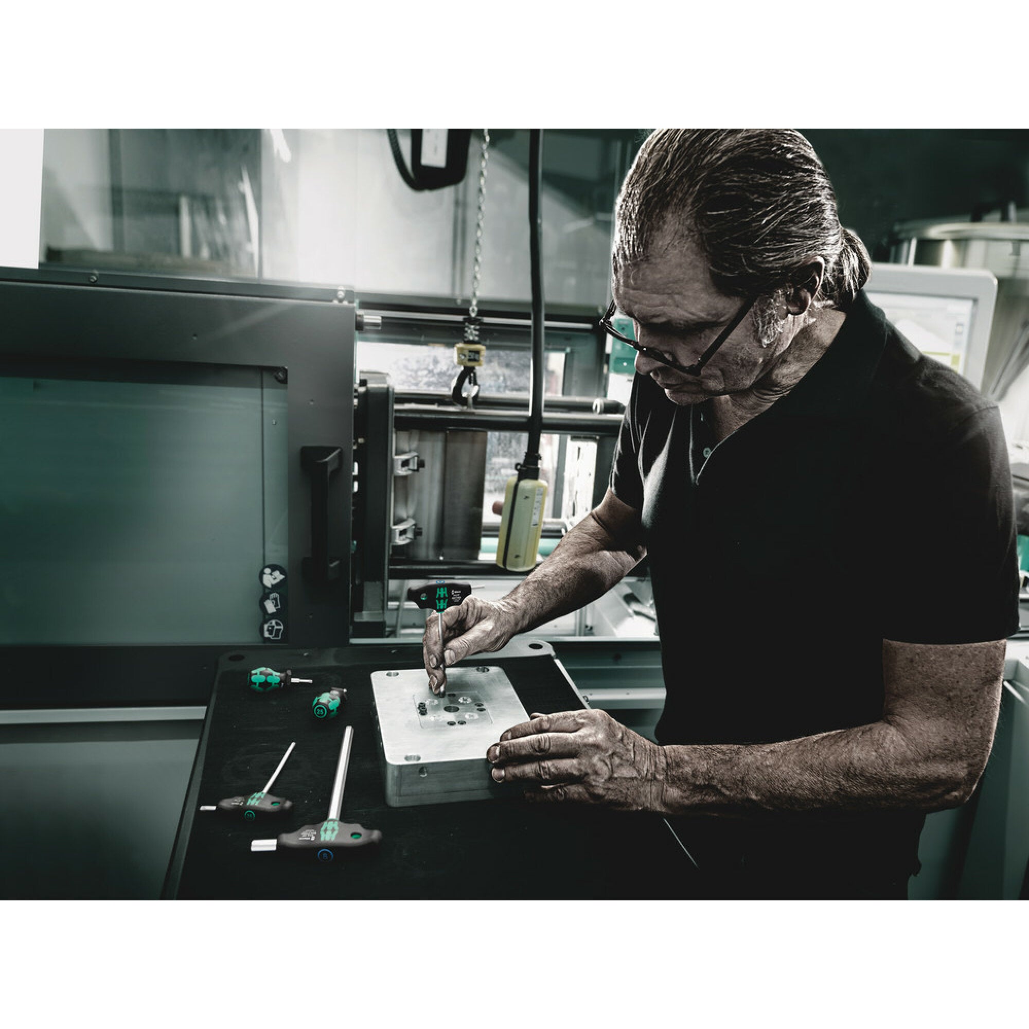 T-handle screwdriver: The ideal handle shape to allow high torque transmission in difficult tightening and loosening situations. The ergonomic shape of the handle fills the palm of the hand well, the fingers lie safely in the soft rounded handle recesses. The whole hand makes contact with the handle and friction losses between the hand and the handle are avoided. Special surface treatment of the blades for high corrosion protection and an optimum fit in the screw head.