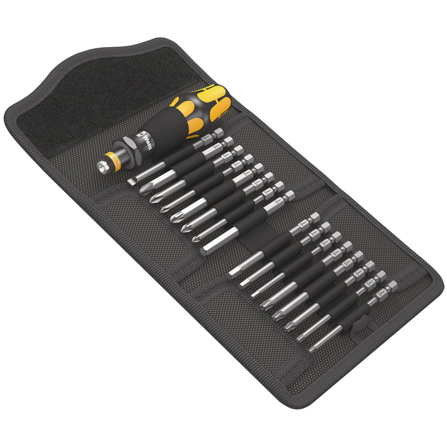 ESD-safe Wera tool. 16 bits. Includes 2 816 R ESD holders, multi-component for high working speeds and particularly ergonomic screwdriving. Dependable protection against electrostatic energy and associated damage. Compact set that enables both manual as well as power tool operations. Simple sorting according to profile and size, easy bit removal and reinsertion; with belt clip, 18-piece.